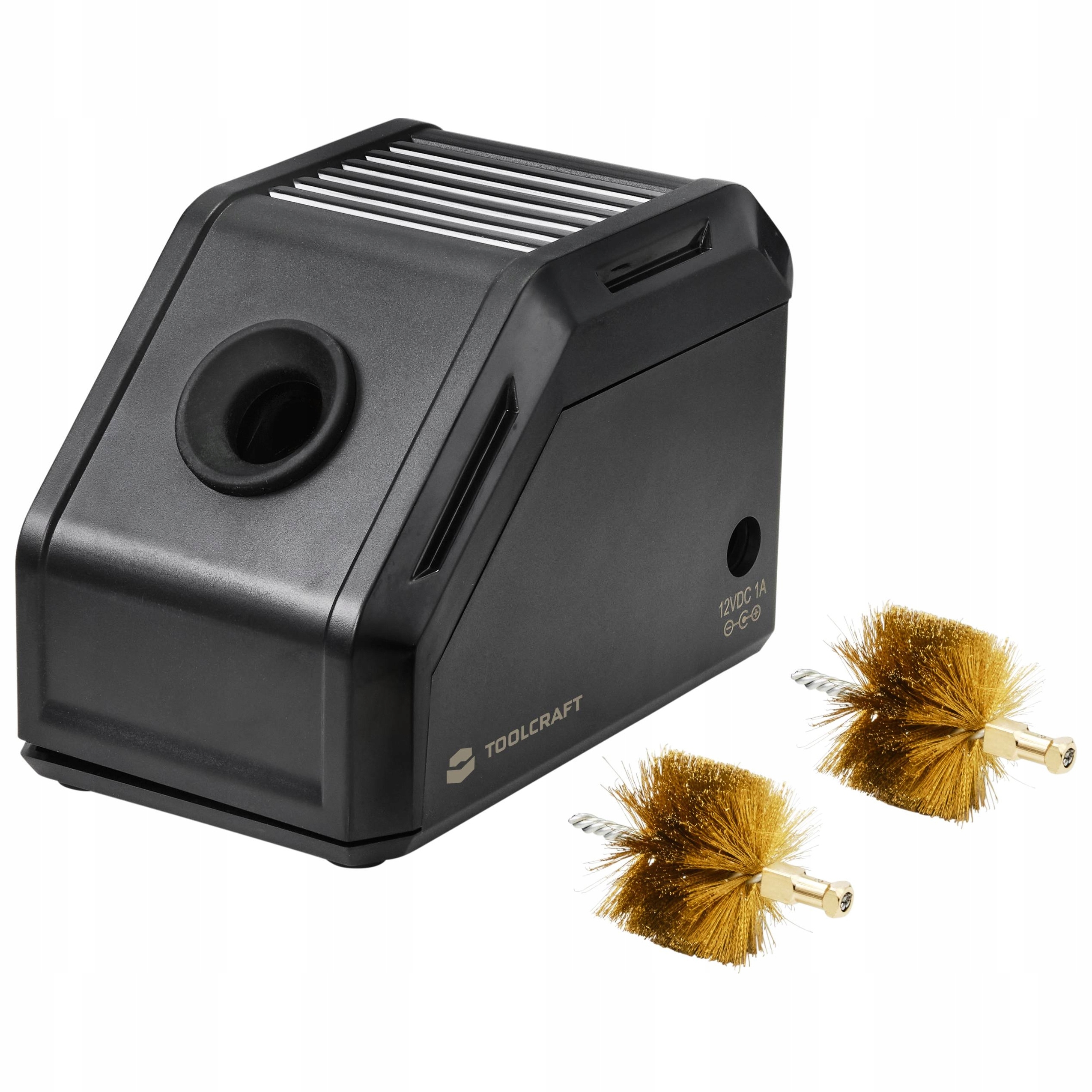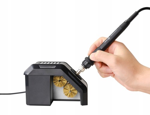 Automatyczne urządzenie do czyszczenia grotów lutowniczych z dwiema szczotkami napędzanymi silnikiem.