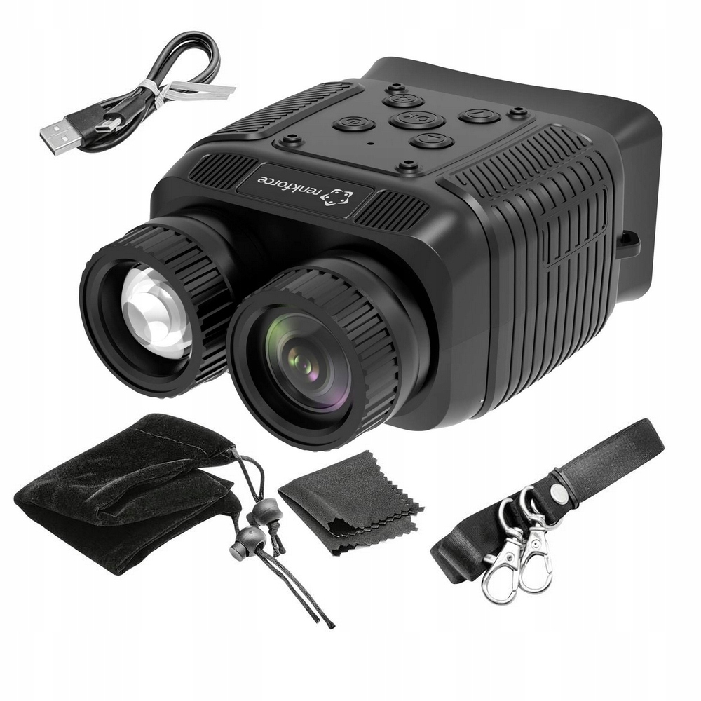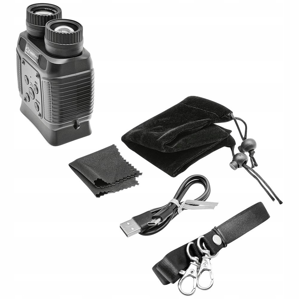 Oprócz noktowizora w zestawie znajduje się praktyczna torba, wygodny pasek do noszenia, ściereczka do czyszczenia obiektywu oraz instrukcja obsługi. Kabel USB-C jest dołączony do ładowania wbudowanej baterii i przesyłania danych.