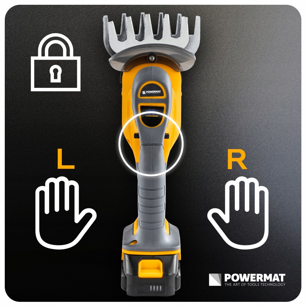 Blokada bezpieczeństwa chroni przed przypadkowym uruchomieniem urządzenia podczas przenoszenia lub przygotowania do pracy. Dwa przyciski przy rączce umożliwiają wygodną obsługę zarówno lewą, jak i prawą ręką.