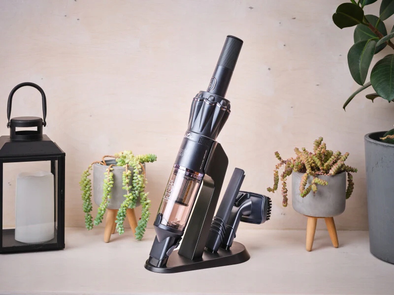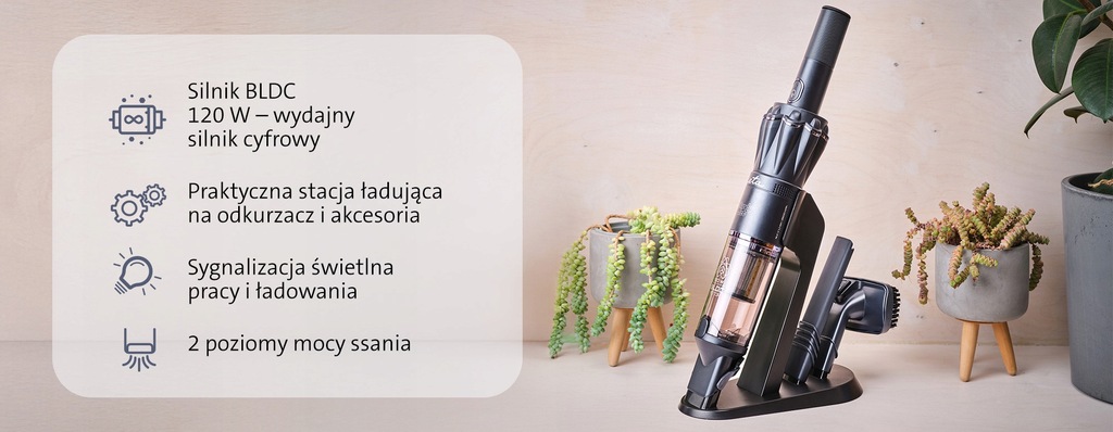 Ręczny odkurzacz ze stojakiem łączy wyjątkowo mocny 120-watowy cyfrowy silnik BLDC nowej generacji, niezwykle niską wagę zaledwie 0,5 kg oraz wydajny akumulator zapewniający do 35 minut pracy – najwięcej w całej serii odkurzaczy HANDY. Dzięki dwustopniowej regulacji siły ssania, kompaktowym wymiarom, filtrowi HEPA z metalowym filtrem wejściowym oraz praktycznym akcesoriom – w tym ssawce szczelinowej i do tapicerki – jest idealnym pomocnikiem do szybkiego i skutecznego sprzątania w domu i w samochodzie. Stacja ładująca pełni jednocześnie funkcję wygodnego stojaka do przechowywania.
