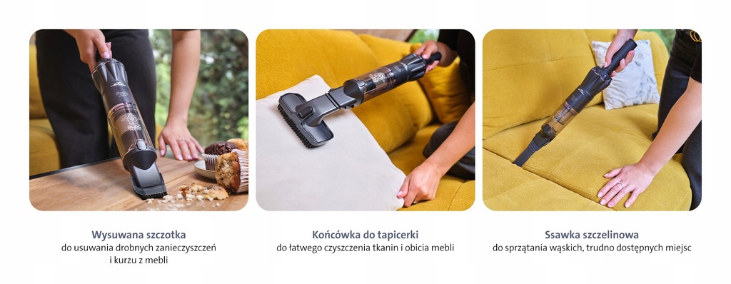 W zestawie znajduje się praktyczny komplet końcówek do sprzątania nawet najbardziej niedostępnych miejsc. Wysuwane szczotka doskonale usuwa kurz i pajęczyny z mebli, obrazów czy ścian. Ssawka do tapicerki delikatnie odkurza tkaniny, meble i usuwa alergeny. Ssawka szczelinowa ułatwia czyszczenie za meblami, w narożnikach, między żeberkami grzejników czy w samochodzie. Wszystkie akcesoria można wygodnie przechowywać w stojaku ładującym.