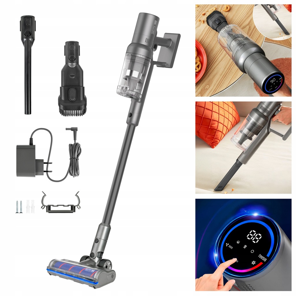 Intuicyjną obsługę odkurzacza umożliwia nowoczesny, dotykowy wyświetlacz LCD. Zapewnia szybki dostęp do ustawień mocy, trybu pracy oraz informacji o stanie baterii. Czytelny interfejs zwiększa komfort użytkowania i pozwala w pełni kontrolować pracę urządzenia podczas sprzątania.