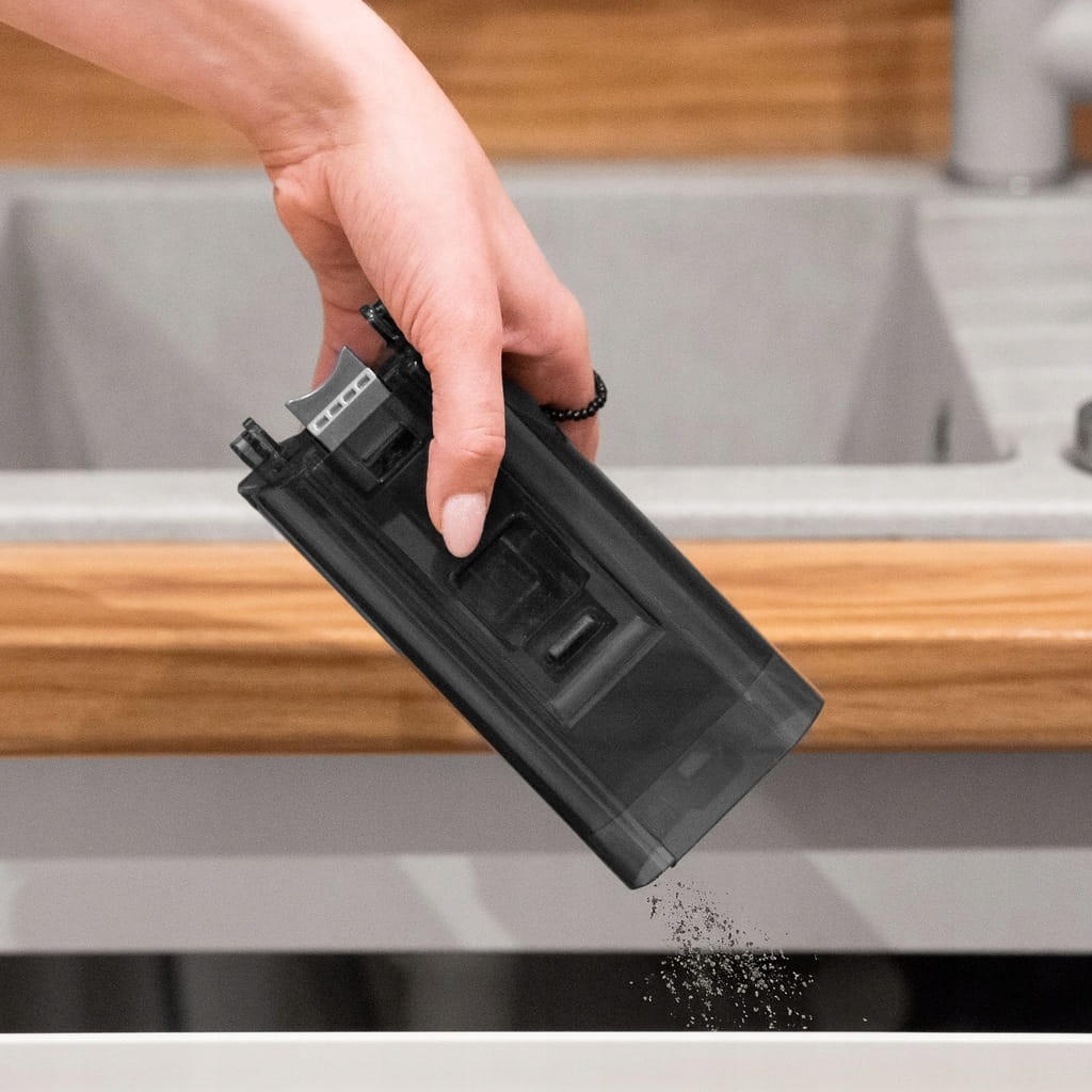 Prosty system opróżniania pojemnika na kurz sprawia, że sprzątanie jest higieniczne i szybkie. Wystarczy jeden ruch, aby opróżnić zbiornik, co pozwala uniknąć kontaktu z brudem i utrzymać urządzenie w czystości.