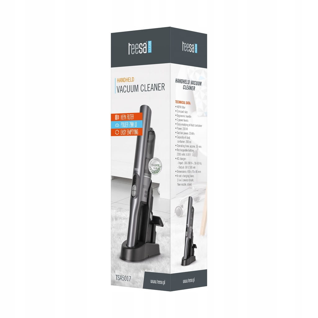 Dzięki niewielkim rozmiarom i ergonomicznemu uchwytowi odkurzacz Teesa jest wygodny w użytkowaniu i przenoszeniu. Lekka konstrukcja sprawia, że nawet dłuższe sprzątanie nie męczy rąk. Z powodzeniem sprawdzi się jako odkurzacz podręczny do domu, biura lub auta.