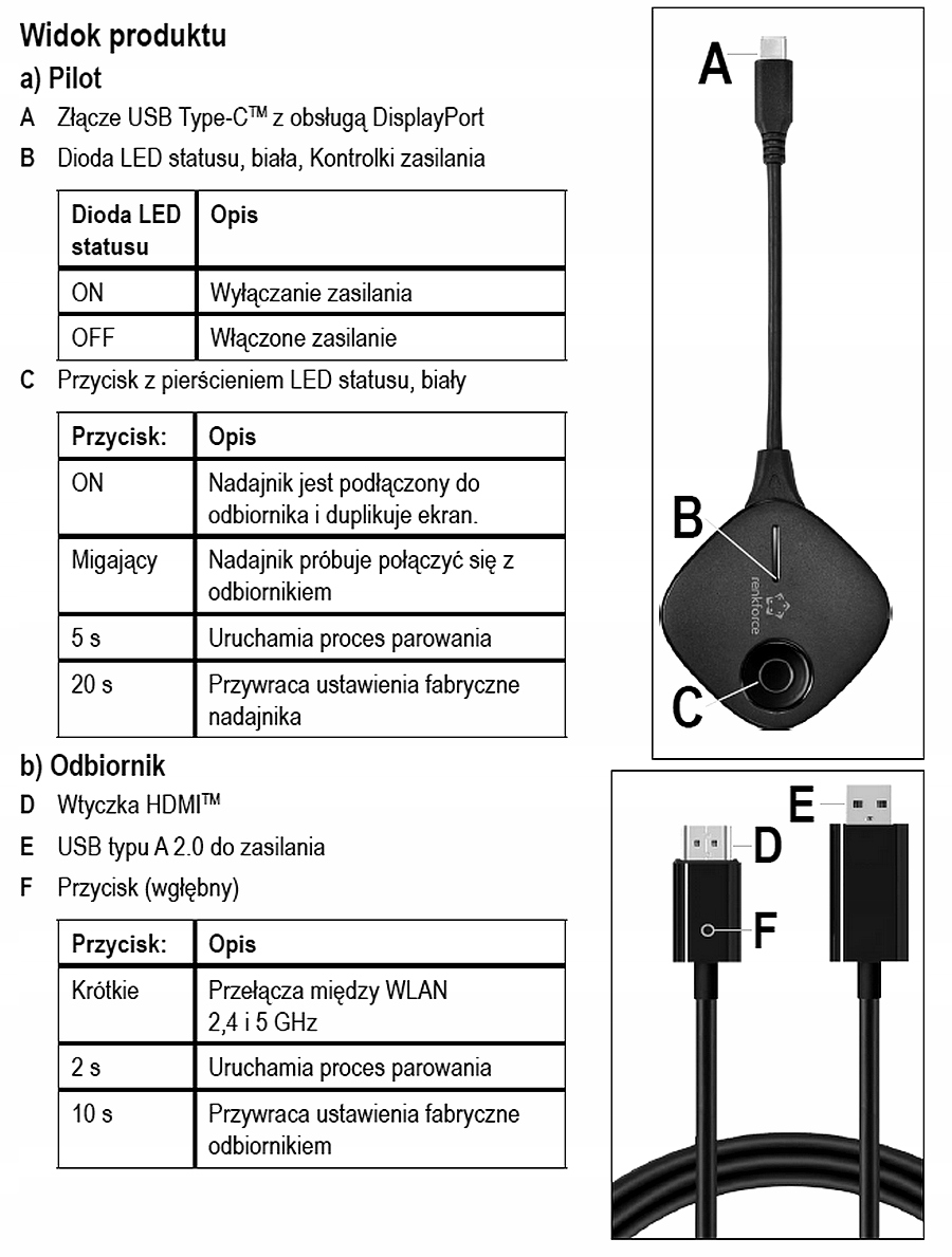- Złącza 1x USB Typ-A 2.0 (zasilanie); 1x HDMITM (HDMI 1.4a, HDCP 2.0)