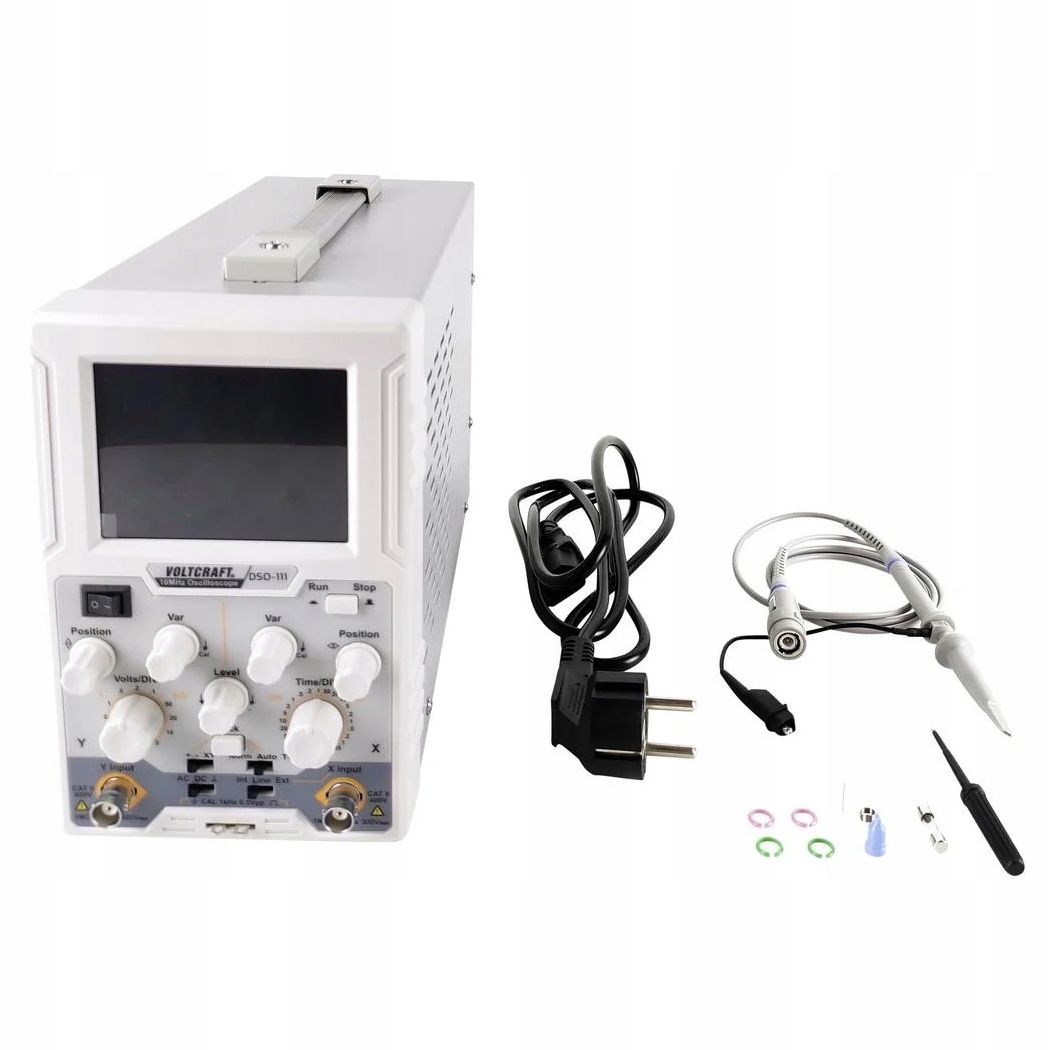 Zakres dostawy oprócz oscyloskopu obejmuje kabel zasilający, sondy z narzędziami do regulacji, zapasowy bezpiecznik oraz skróconą instrukcję obsługi.
