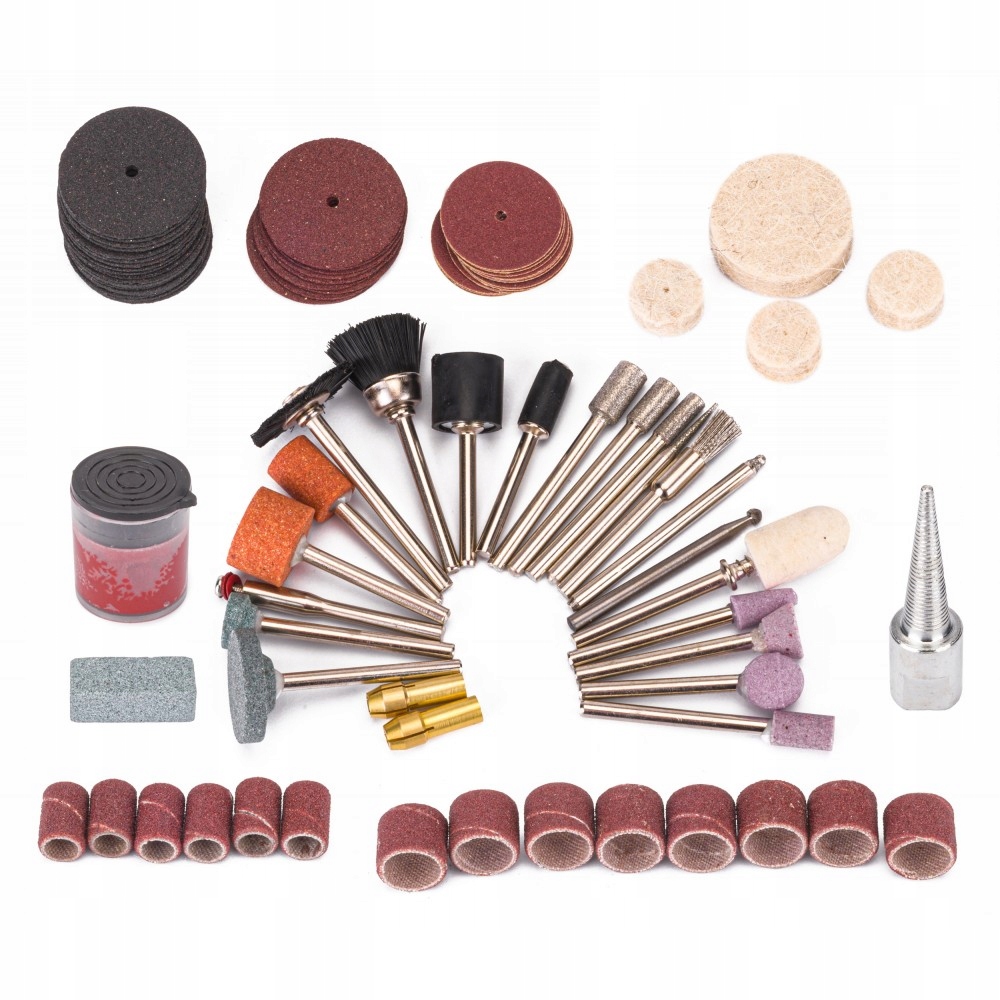 - Zestaw trzpieni, tarcz, filców, frezów, papierów ściernych