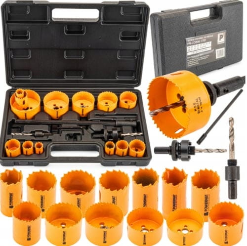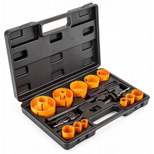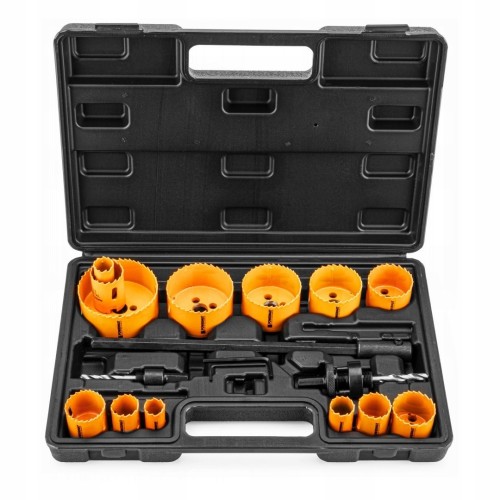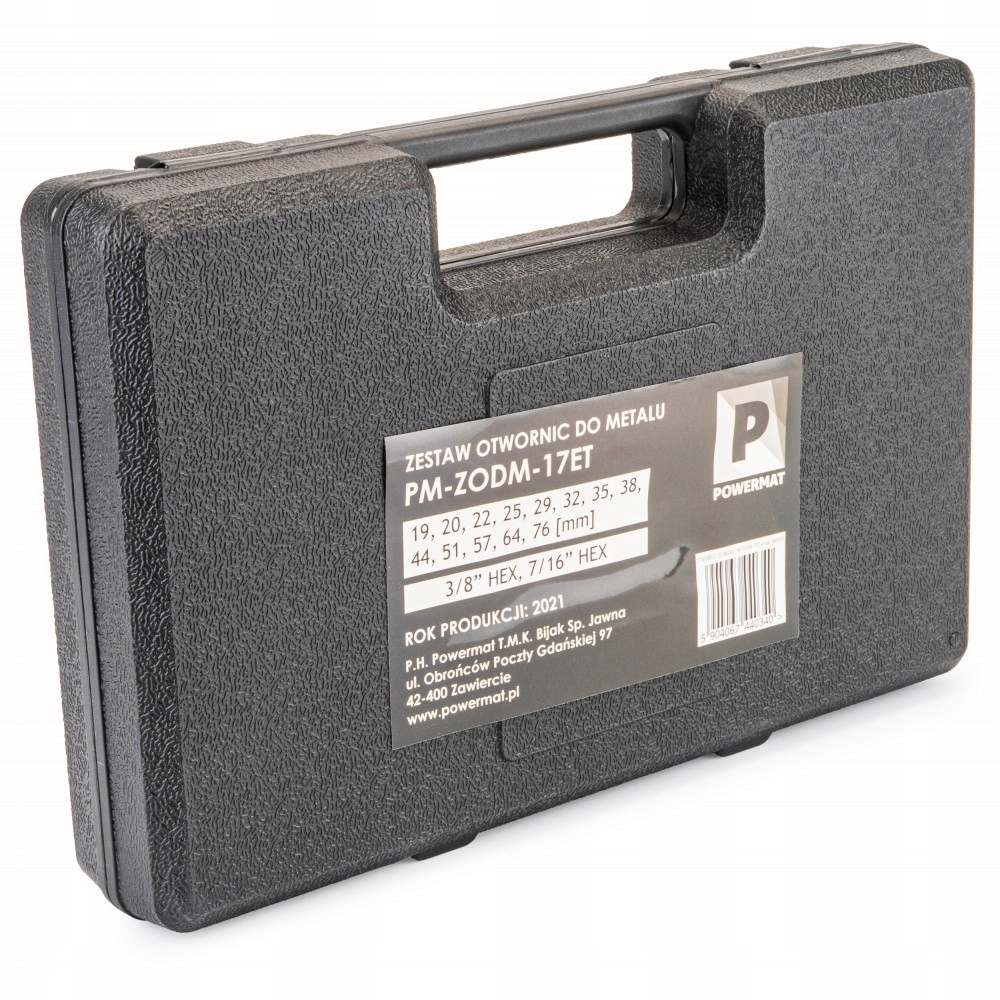 - 13 sztuk otwornic: 19, 20, 22, 25, 29, 32, 35, 38, 44, 51, 57, 64, 76 mm