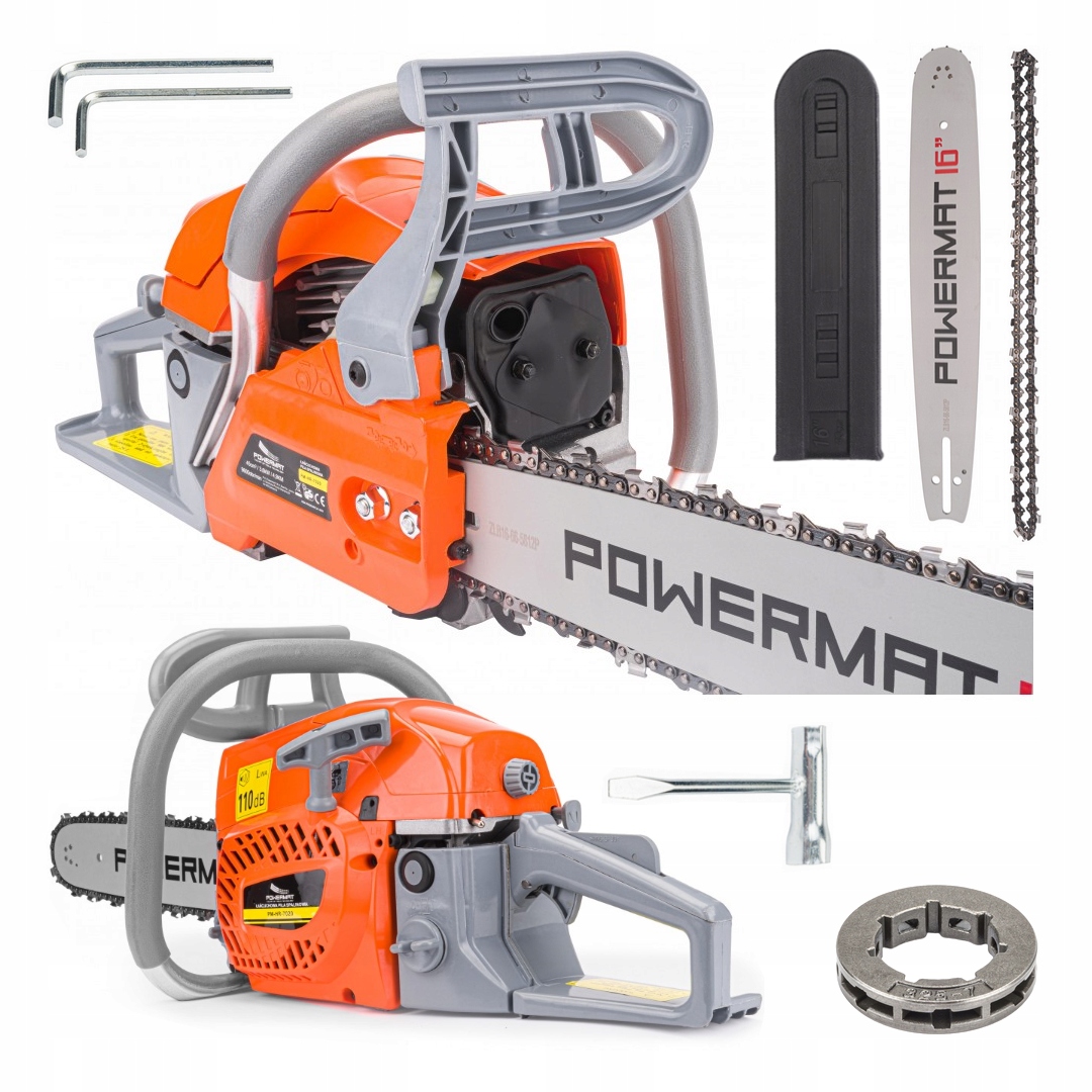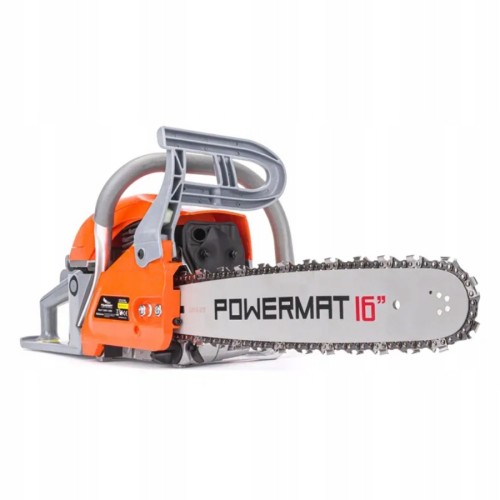 Piła marki Powermat jest najnowszym modelem piły spalinowej do zastosowań zarówno amatorskich jak i profesjonalnych. Moc urządzenia to 4,9KM uzyskiwana przez silnik o pojemności 52cm3. Piła wykonana jest z najwyższej jakości podzespołów zamkniętych w solidnym aluminiowo-magnezowym karterze. Zastosowany wzmocniony stop magnezowy klasy AZC1231, ma zwiększoną wytrzymałość na rozciąganie oraz dużo wyższą twardość od innych metali stosowanych do produkcji pił spalinowych. Stopy tego rodzaju mają podwyższoną odporność na korozję. Ponadto komponenty wykonane są najnowocześniejszą metodą tiksotropowego odlewania ciśnieniowego, dzięki temu uzyskano najwyższą możliwą trwałość elementów. Dzięki japońskiemu gaźnikowi Walbro nigdy nie będziesz miał problemu z odpaleniem piły. Pływająca zębatka ułatwia zakładanie łańcucha i zwiększa wytrzymałość na przeciążenia. Piła jest wyposażona w funkcję antywibracyjną, hamulec bezpieczeństwa, sprzęgło oraz automatyczne smarowanie łańcucha.