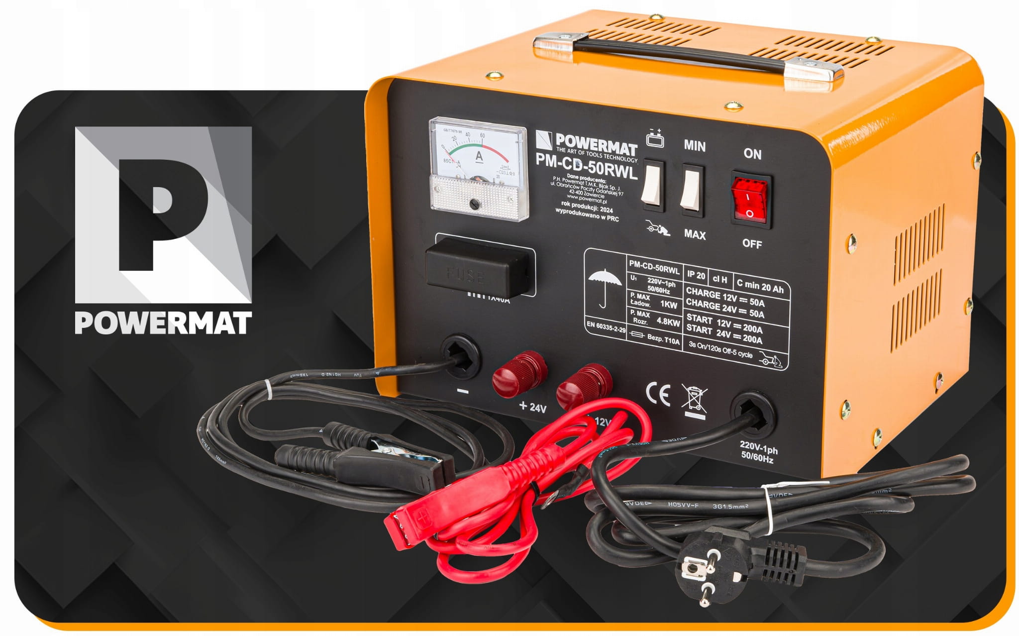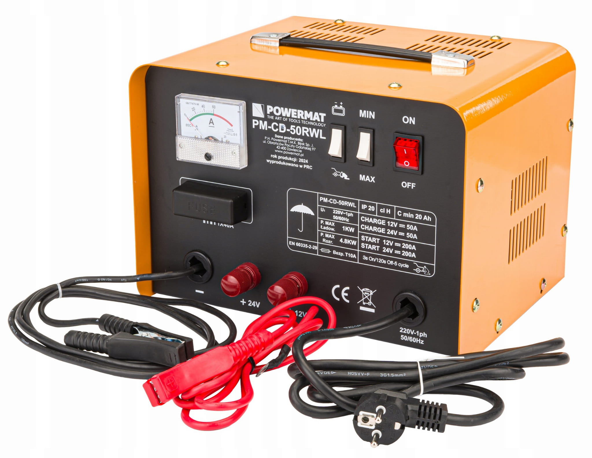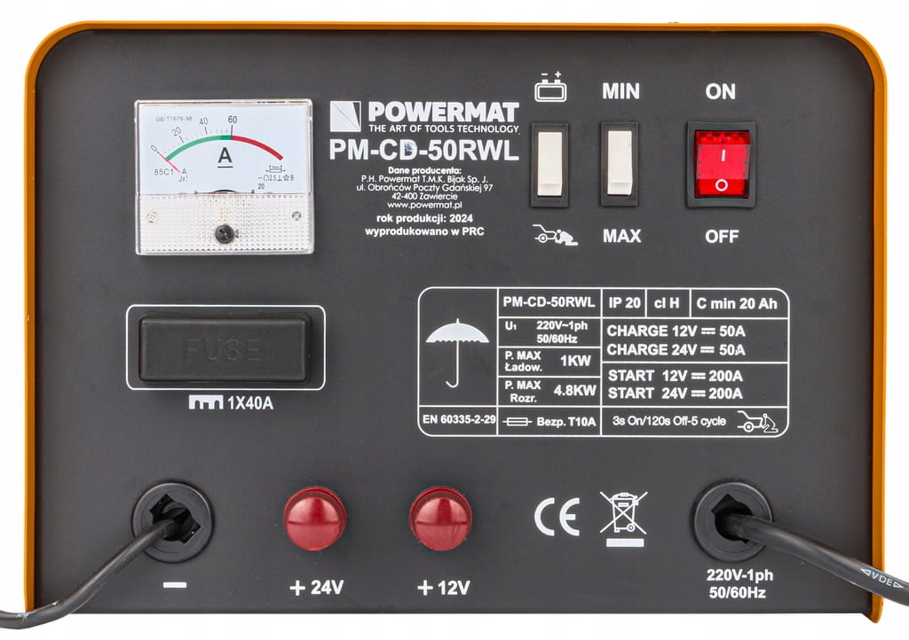 Prostownik posiada analogowy amperomierz dwa przyłącza prądowe PLUS 12V i 24V, bezpiecznik 50A oraz przewód minusowy zamontowany na stałe.