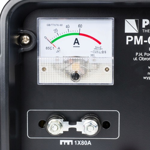 Prostownik posiada analogowy amperomierz dwa przyłącza prądowe PLUS 12v i 24v, bezpiecznik 80A oraz przewód minusowy zamontowany na stałe.
