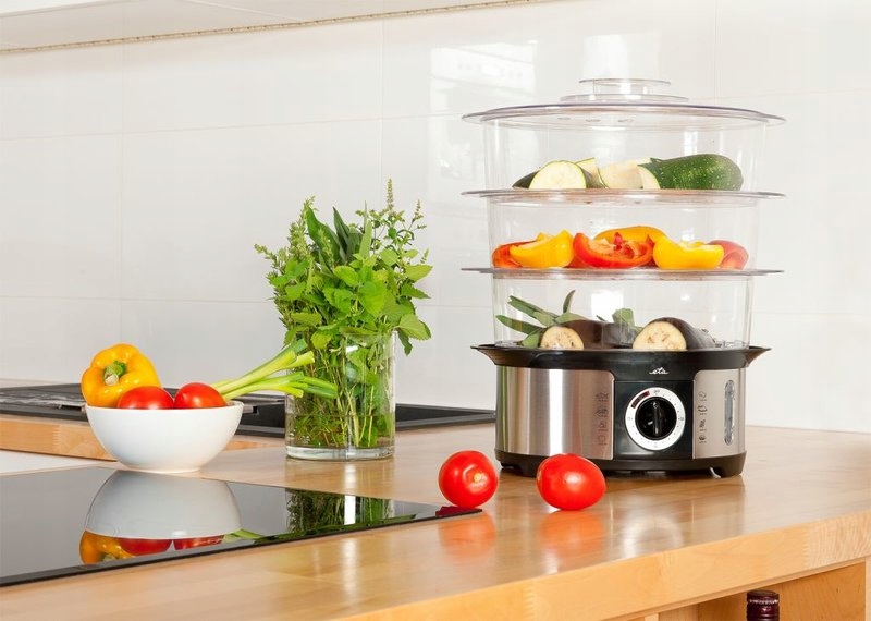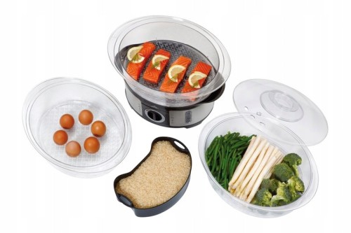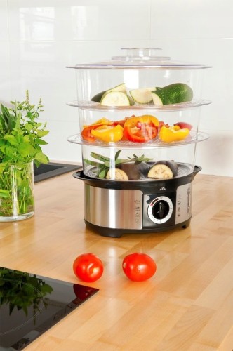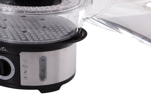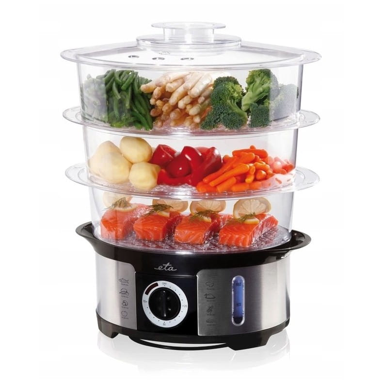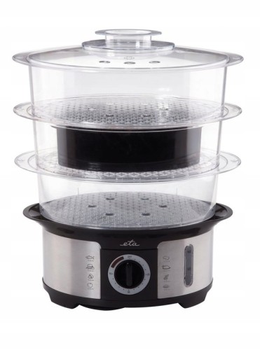 Parowar ETA Steampot jest idealny do zdrowego przygotowania mrożonych i świeżych warzyw, mięsa, ryb i owoców morza. Jego wielką zaletą jest bardzo szybkie wytwarzanie pary. Przy przetwarzaniu żywności podczas użycia pary, potrawy zachowują podstawowe witaminy, minerały i środki smakowo-zapachowe, które przy klasycznym gotowaniu są uwalniane do wody. Podczas gotowania w parze potrawy się nie przypalą, nie muszą być mieszane i utrzymują swój kształt i konsystencję. Urządzenie składa się z głównej podstawy i trzech przezroczystych pojemników o całkowitej pojemności 12,25 litra. W pakowaniu jest miska do gotowania ryżu. Przeźroczyste pojemniki zaopatrzone w profilowane dno umożliwiające ułożenie jajek. Przydatnym pomocnikiem jest 75 minutowy czasomierz. Proces ogrzewania i pracy sygnalizują dwie lampki kontrolne. Zakończenie procesu parowania sygnalizuje sygnał dźwiękowy. Używanie ułatwi również możliwość uzupełniania wody z zewnątrz, a także wskaźnik poziomu wody, który pokazuje stan wody.