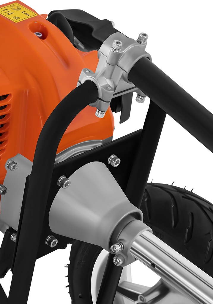 Dzięki zastosowaniu mocnego silnika o maksymalnej mocy 5,2 KM, aluminiowej lekkiej ramy oraz dużych, solidnych kół, urządzenie oferuje bardzo dobrą manewrowość i stabilność. Regulacja kąta nachylenia oraz składany, regulowany uchwyt pozwalają na wygodne dopasowanie pozycji roboczej do użytkownika. Automatyczne sprzęgło odśrodkowe, spiralna przekładnia stożkowa oraz elastyczny wałek zapewniają płynną i niezawodną pracę napędu.