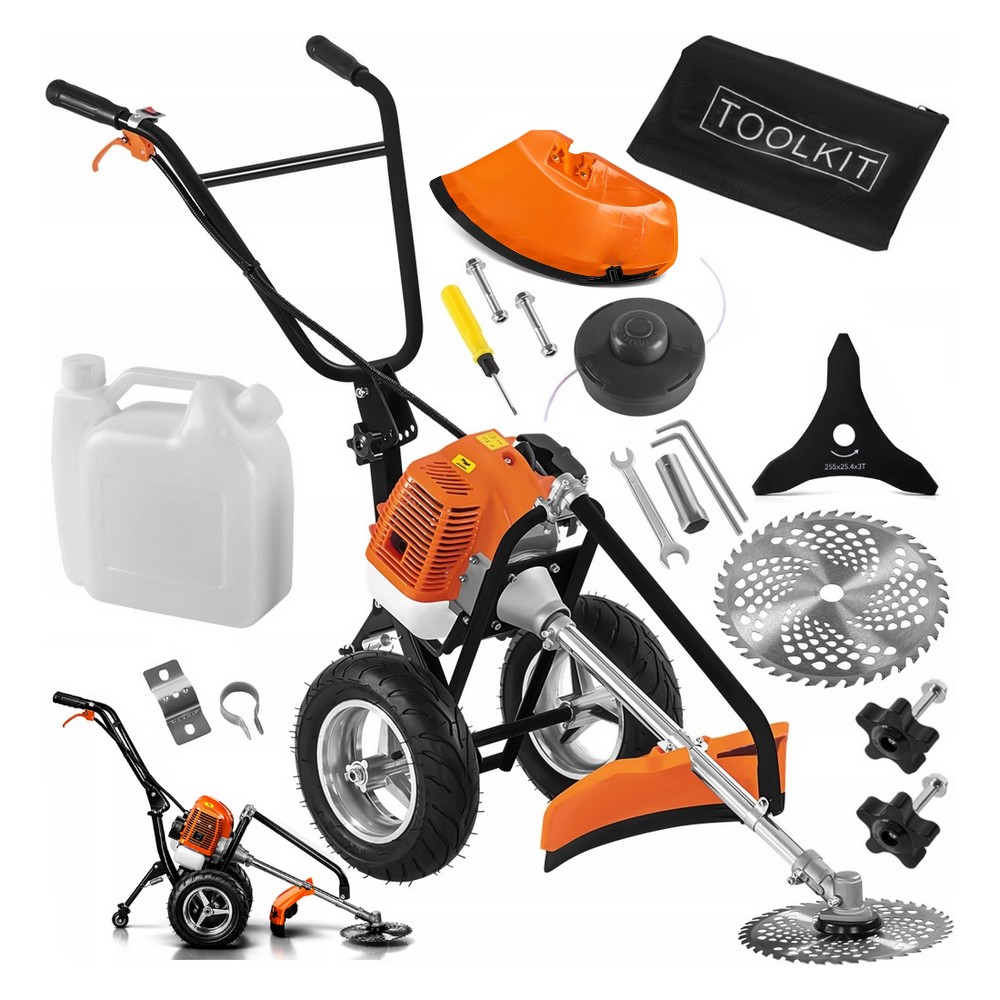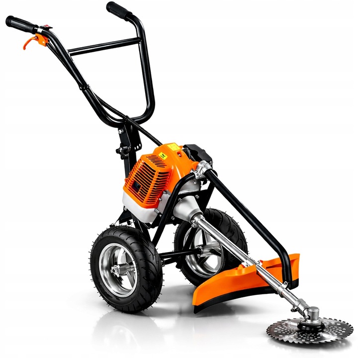 Wydajna i solidna podkaszarka spalinowa na kółkach, zaprojektowana do pracy w miejscach, gdzie tradycyjne kosiarki kołowe lub jezdne nie są w stanie skutecznie działać. Doskonale sprawdza się na zboczach, w terenach gęsto porośniętych drzewami, przy ogrodzeniach oraz w trudno dostępnych miejscach wymagających dużej mocy i precyzji.