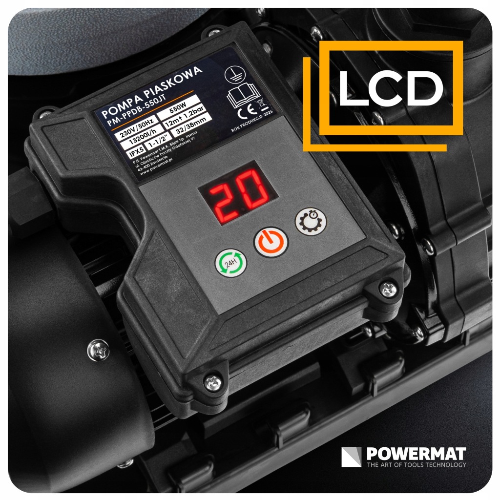 WYDAJNOŚĆ 13 200 L/H | MOC 550W | 7 TRYBÓW | MANOMETR | TIMER LCD | IPX5 | KOSZ SITKOWY