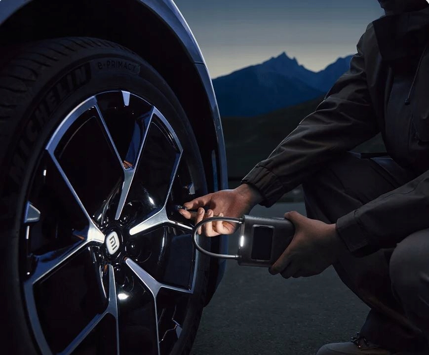 Urządzenie wyświetla także ciśnienie w oponach w czasie rzeczywistym i zatrzymuje się automatycznie po osiągnięciu żądanego ciśnienia.