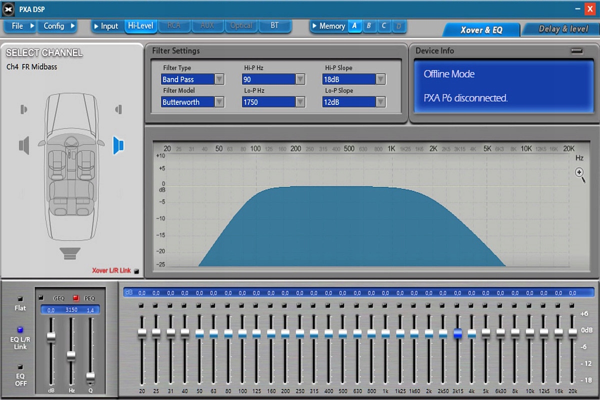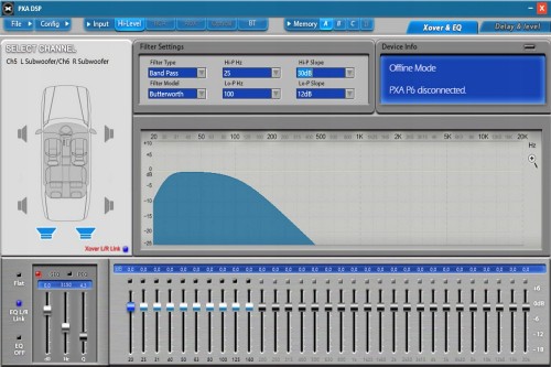 - Filtry 2 lub 3-drożnej zwrotnicy aktywnej, niezależnie dla każdego kanału: Full / HPF / LPF / BPF