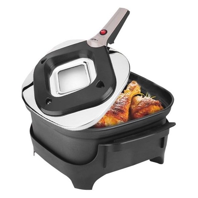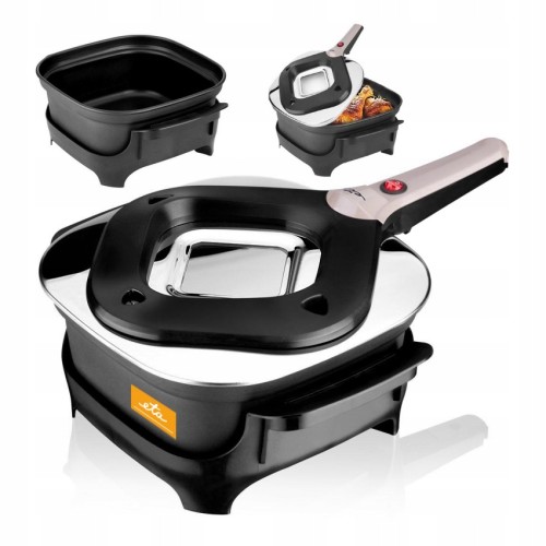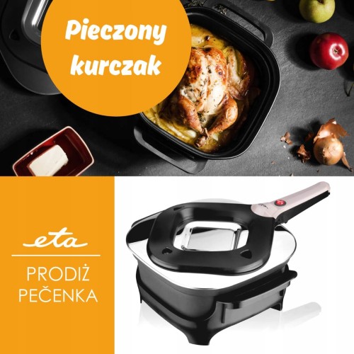 Ten elektryczny prodiż przeznaczony jest do różnych sposobów gotowania. Od klasycznego pieczenia, po gotowanie aż do duszenia i brązowienia potraw. Posiłki w nim przygotowywane nie tracą smaku, mięso nie wysycha a gotowanie jest aż do 80% bardziej wydajna niż w tradycyjnym piekarniku. Dzięki prodiżowi ETA upieczenie biszkoptu w 15 minut jest realne. Pachnące, soczyste mięso i chrupiący deser bez problemu przygotujesz poza ciężkim sprzętem w swojej kuchni. W jaki sposób? ETA ma rozwiązanie, które umożliwia w małych kuchniach mieszkalnych, domkach lub na wakacjach piec komfortowo, z niskim zużyciem energii, wszystko znajdziesz w ETA. To praktyczne urządzenie posiada nieprzywierającą powłokę (teflon) oraz kwadratowy kształt. Pokrywa z wykończeniem ze stali nierdzewnej posiada otwory wentylacyjne oraz szklane okienko. Nie musisz już podnosić całej pokrywy aby zobaczyć na jakim etapie jest Twoja potrawa, wystarczy zajrzeć przez szybę. Bezpieczeństwo w użytkowaniu zapewnia specjalna blokada, która wyłącza urządzenie w chwili zdejmowania z niego pokrywy (nawet w wypadku włączonego przycisku na pokrywie). Zarówno stabilny stojak oraz uchwyty są izolowane dzięki czemu bez problemu przeniesiesz oraz postawisz gorące danie gdzie chcesz (bez przekładania potrawy do innego naczynia). Kolejnym praktycznym elementem jest długi przewód zasilający (1,5 m). Prodiż ETA, to ciągle doskonalone urządzenie z którego wielu użytkowników korzysta od ponad 50 lat.