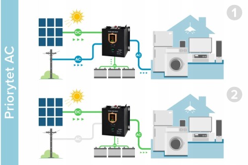 1. W ciągu dnia (światło słoneczne jest wystarczające) a urządzenia podłączone są również do zasilania sieciowego: ogniwa fotowoltaiczne będą zasilały urządzenia zewnętrzne, w tym samym czasie ładując akumulator (zasilanie sieciowe będzie w tym czasie w trybie czuwania).
