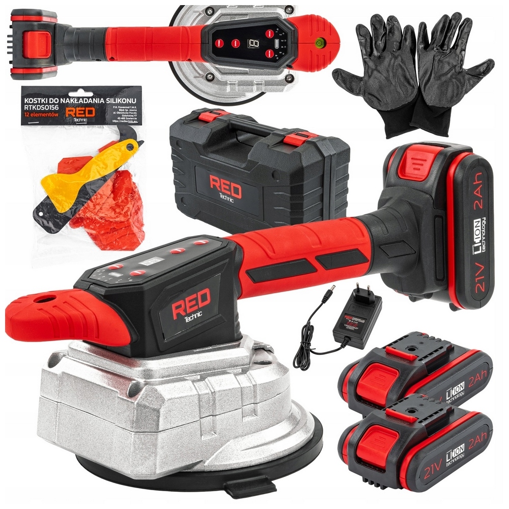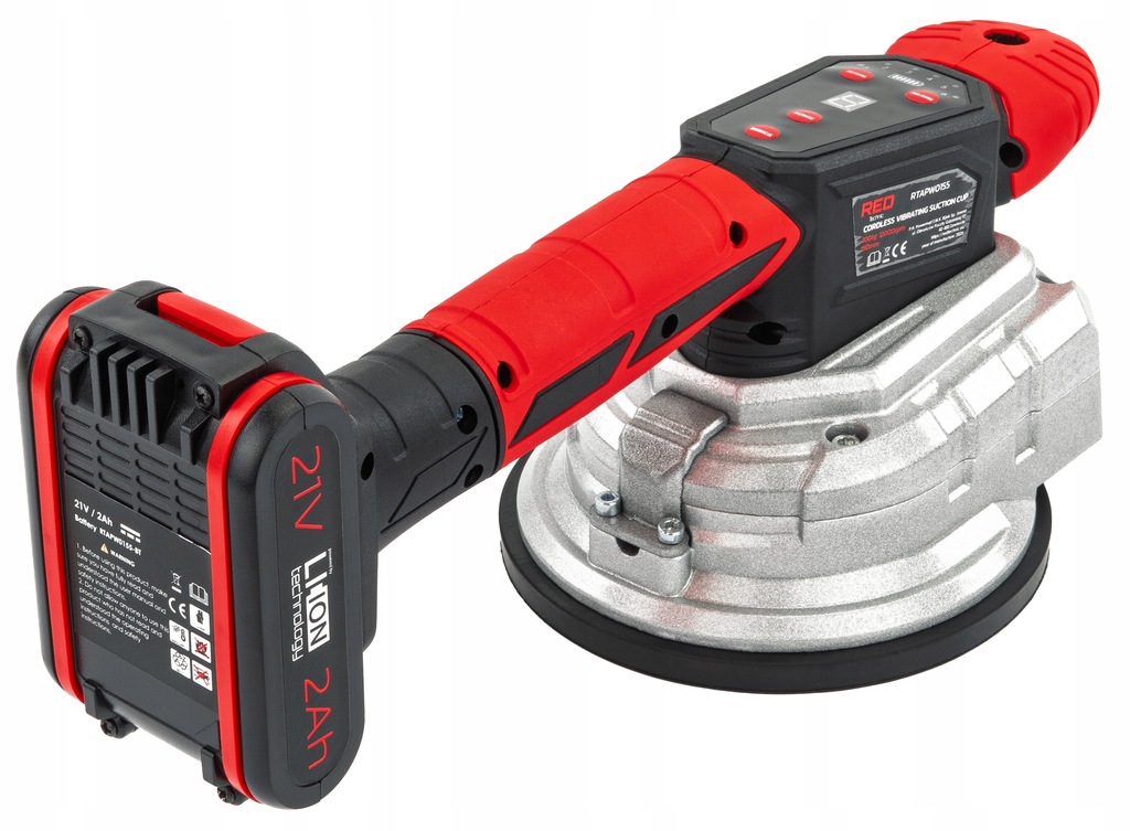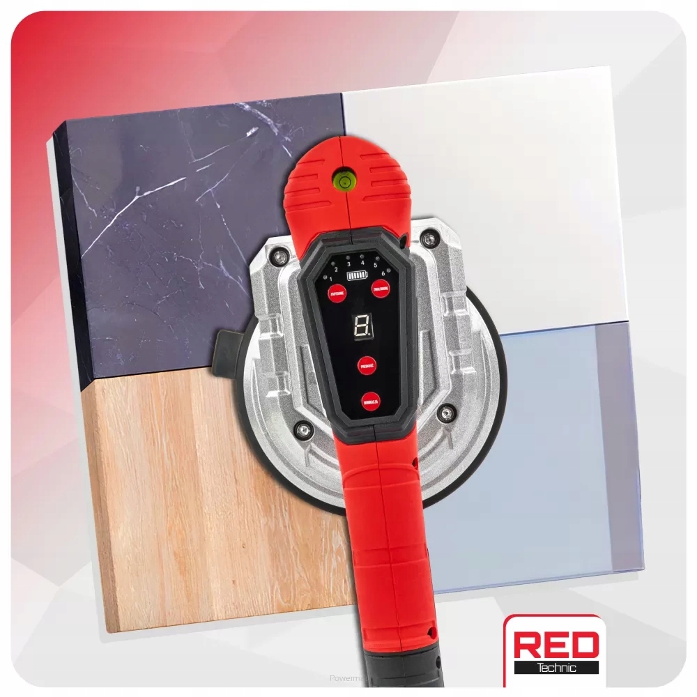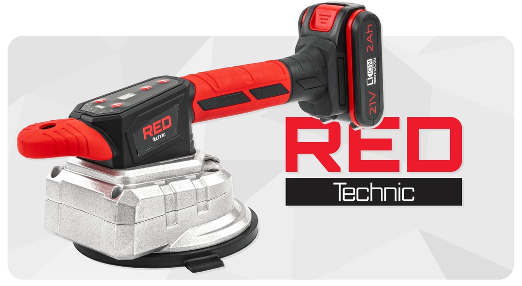Przyssawka RED Technic to akumulatorowe, wibracyjne narzędzie do precyzyjnego montażu płytek i gładkich powierzchni (do 100 kg). Umożliwia obsługę jedną ręką, oferuje 9-stopniową regulację wibracji, podwójny uchwyt, LCD i poziomicę.