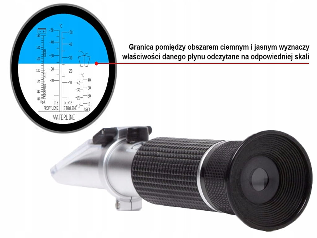 Urządzenie służące do pomiaru właściwości cieczy za pomocą załamania światła. Refraktometr "samochodowy" przeznaczony jest do pomiaru substancji używanych w układach chłodzenia samochodów, pomp ciepła, kolektorów słonecznych i innych systemów, w których stosuje się substancje i ciecze niezamarzające, tj.: