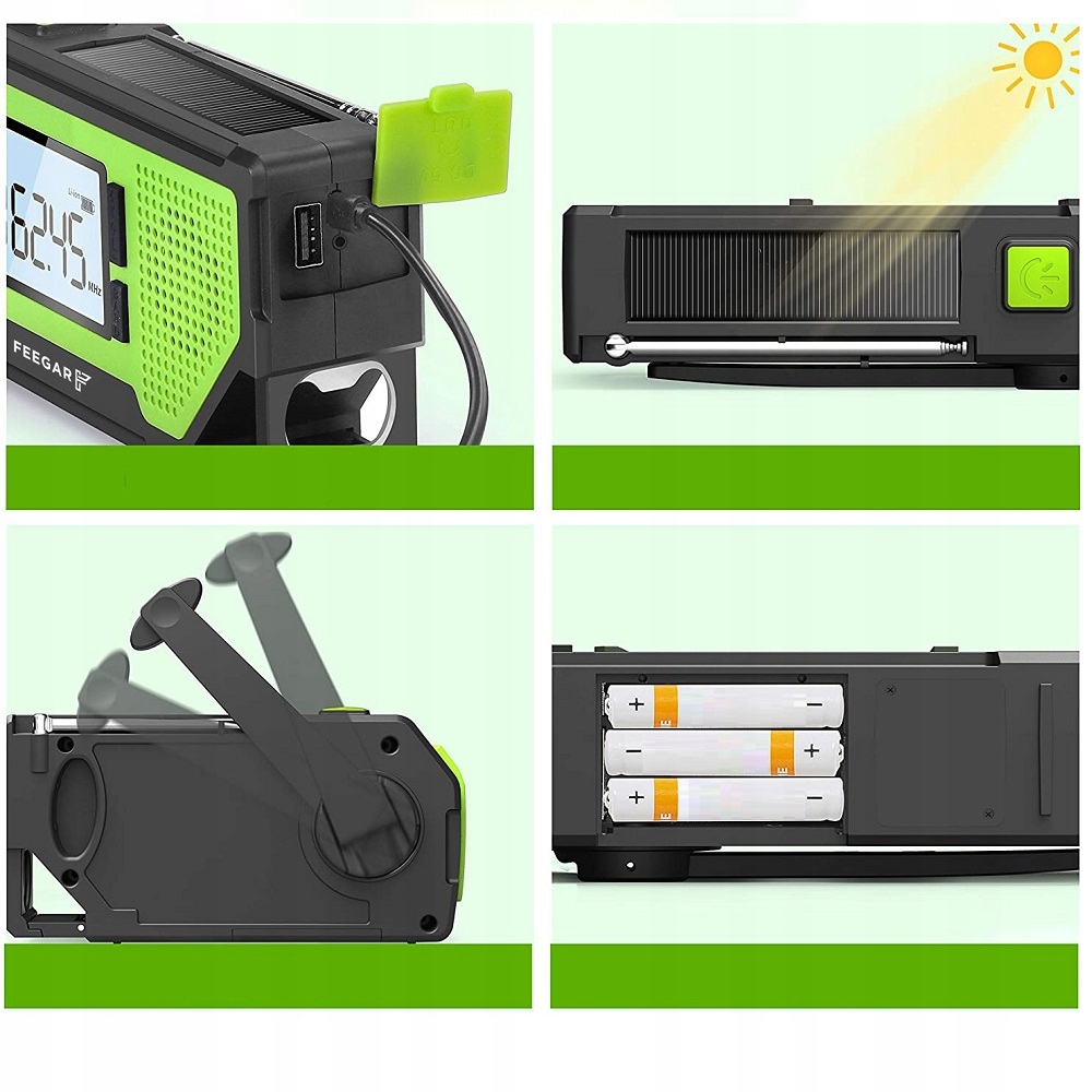 - Awaryjne radio Feegar OZE PRO ma wbudowaną baterię o pojemności 2000 mAh, którą można także ładować poprzez panel solarny oraz korbę dynamo. Świetnie sprawdzi się to w ustronnych i cichych miejscach, w których nie ma gniazdka w pobliżu. Dodatkowo można je zasilać za pomocą Baterii AAA lub przez kabel USB dołączony do opakowania.