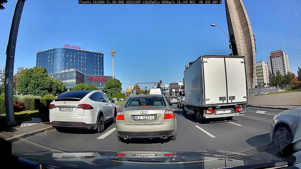 Obraz wideo z obu kamer jest ciągle buforowany w wewnętrznej pamięci, dzięki czemu nagrania zdarzeń (np. stłuczka) obejmują czas 10 sekund przed wystąpieniem zdarzenia i 10 sekund po nim. Autorski tryb nagrywania poklatkowego „Smart” (zmienna ilość klatek na sekundę) znacznie oszczędza miejsce na karcie, co umożliwia zapisanie ok. 5 razy więcej czasu rzeczywistego w porównaniu ze standardowym nagrywaniem, bez pogorszenia jakości obrazu i płynności ruchu w nagraniach dokumentujących zdarzenia. Rejestrator FineVu GX1000 wyposażono w profesjonalny tryb parkingowy z wykrywaniem ruchu (przód i tył) wraz z układami chroniącymi akumulator pojazdu przed rozładowaniem (także w pojazdach z napędem hybrydowym o podwyższonym napięciu) oraz w energooszczędną opcję trybu parkingowego o bardzo niskim poborze prądu z akumulatora pojazdu (ok. 5 mA). Technologia sztucznej inteligencji (Ai) rozpoznaje charakterystykę wstrząsów, filtruje i pomija fałszywe lub eksploatacyjne wstrząsy (np. trzaśnięcie drzwiami) oraz wyświetla na ekranie smartfona ilość zdarzeń i elementy nadwozia pojazdu, które mogły zostać uderzone podczas ostatniego postoju. W zestawie jest kompletne wyposażenie wraz z kartą pamięci 32GB. Nie trzeba kupować żadnych dodatkowych kabli, ani zewnętrznych modułów zasilających dla trybu parkingowego. FineVu GX1000 ma to wszystko w standardowym wyposażeniu.