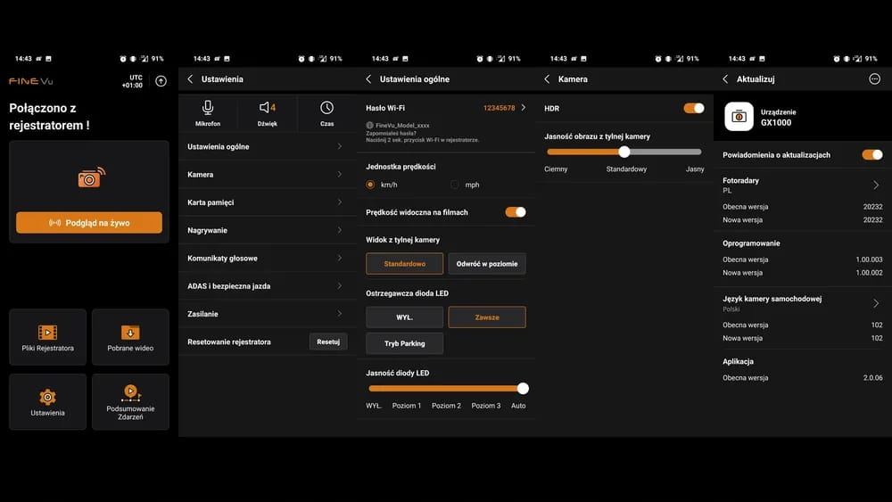 - Aplikacja FineVu Wi-Fi: ustawienia rejestratora, podgląd obrazu na żywo, przeglądanie i pobieranie nagrań, ilość i szczegóły zdarzeń, czas jazdy i parkowania, przejechany dystans, średni prędkość jazdy, podgląd trasy na mapie, aktualizacja oprogramowania, bardzo prosta obsługa.
