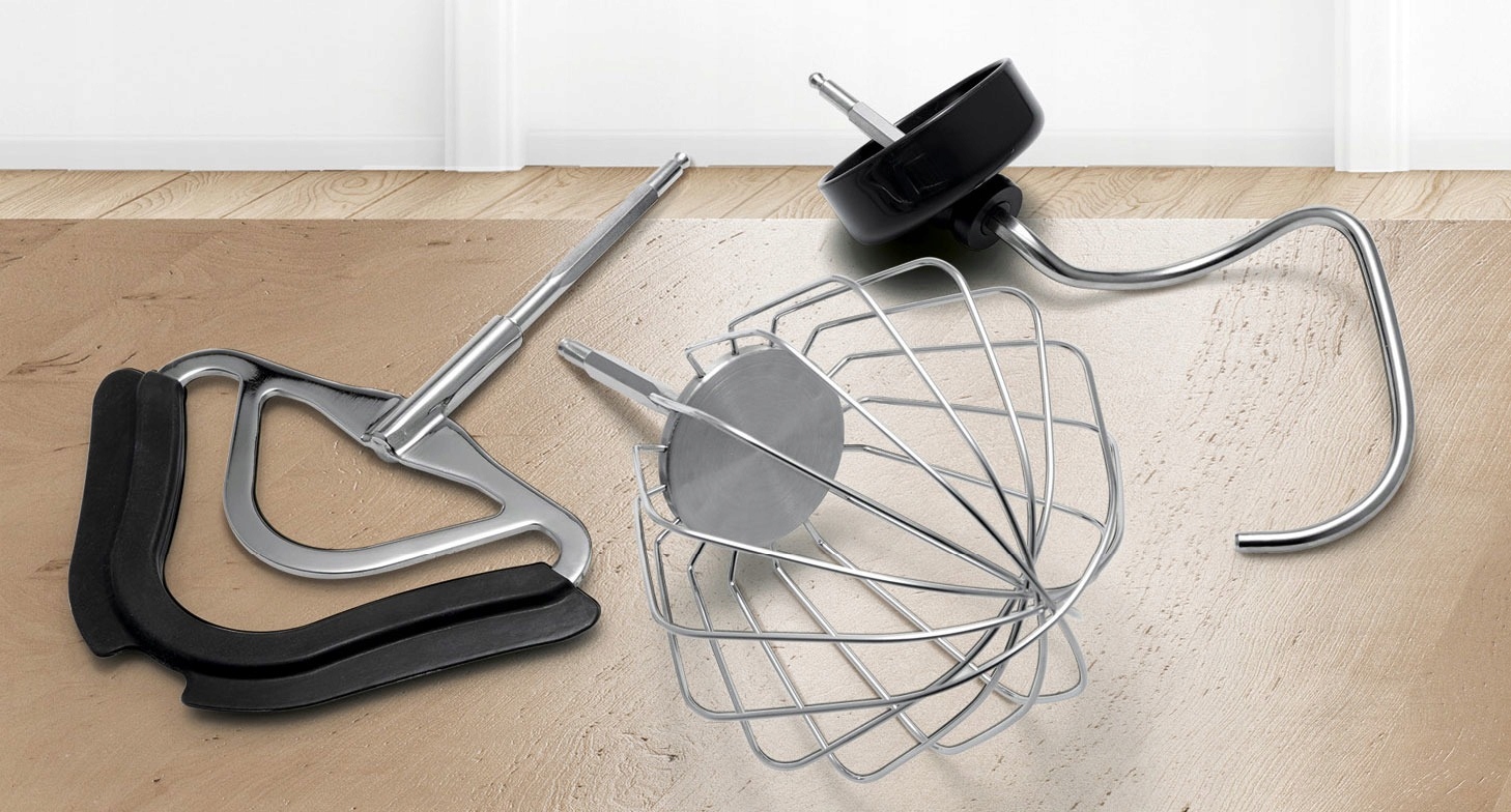 W zestawie: mieszadło z silikonową krawędzią, mieszadło do ubijania (z regulacją wysokości, wykonane w całości z metalu) oraz hak do zagniatania. Wszystkie akcesoria można myć w zmywarce.