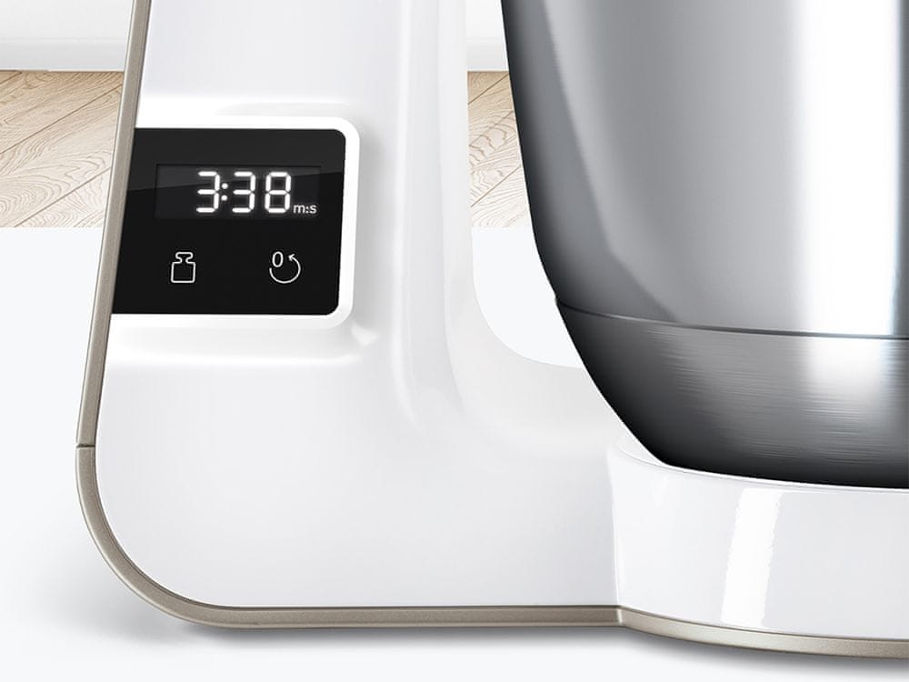 Robot kuchenny wyposażony jest w zintegrowaną wagę z funkcją tarowania, dzięki której można precyzyjnie zważyć składniki o ciężarze nawet do 5 kg. Co więcej, waga działa zarówno z misą, jak i innymi akcesoriami np. z blenderem kielichowym. Znacząco ułatwia to pracę w kuchni i pozwala zaoszczędzić czas na szukaniu np. dodatkowych wag, miar czy innych przeliczników (np. ile gram to 1 szklanka). Oszczędzimy również czas na mycie misy lub miarki w której dotychczas odmierzaliśmy składniki