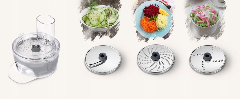 Nie zapominajmy o tarce z wymiennymi tarczami, która ułatwi tarcie warzyw, serów czy pieczywa na bułkę tartą. Przygotowanie twojej ulubionej sałatki stanie się bezproblemowe!