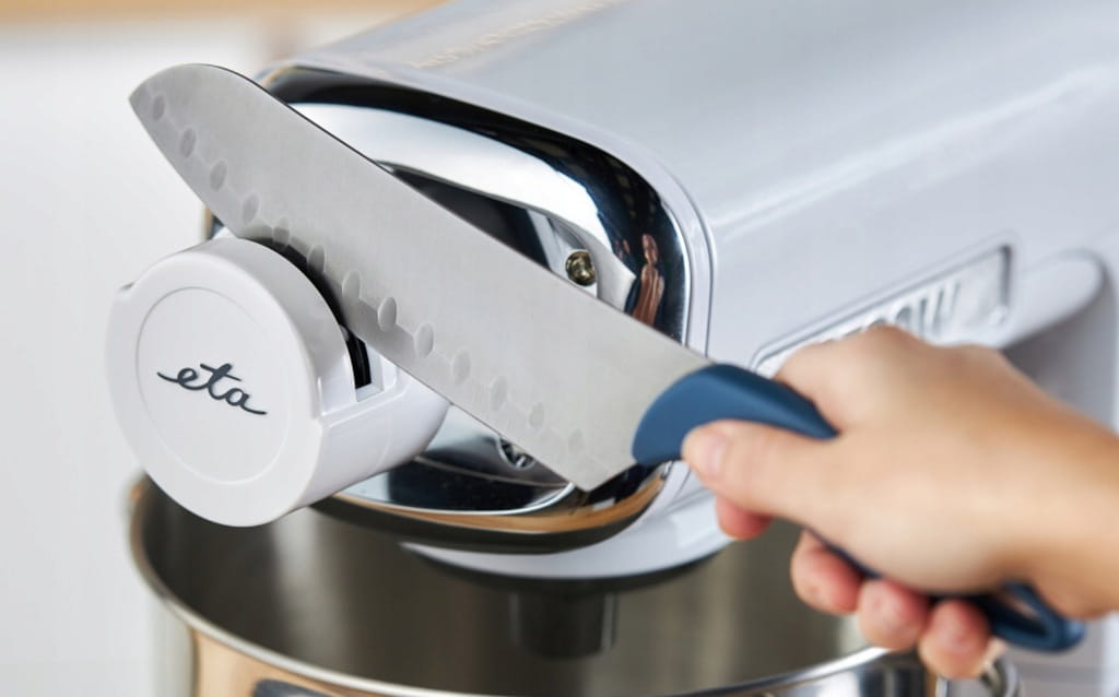 Na wyposażeniu robota kuchennego ETA Mezo III znajdziesz także wyjątkową ostrzałkę do noży z ceramicznymi wałkami, która zadba o krawędź wszystkich Twoich noży ze stali nierdzewnej i stali.