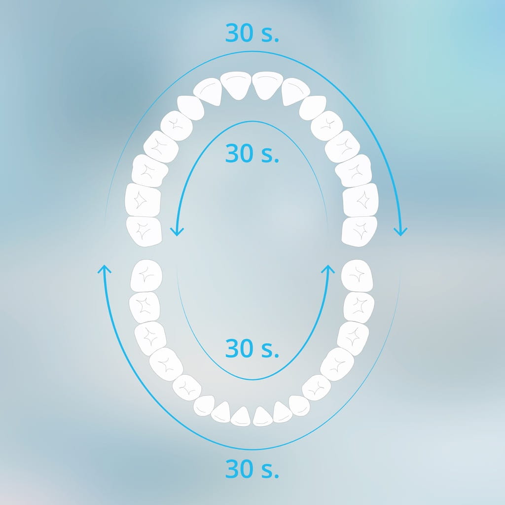 Inteligentny timer co 30 sekund przypomni Ci zmianie obszaru szczotkowania, co pomaga w równomiernym czyszczeniu całej jamy ustnej. Po dwóch minutach szczoteczka wyłącza się automatycznie, zapewniając optymalny czas mycia zębów.