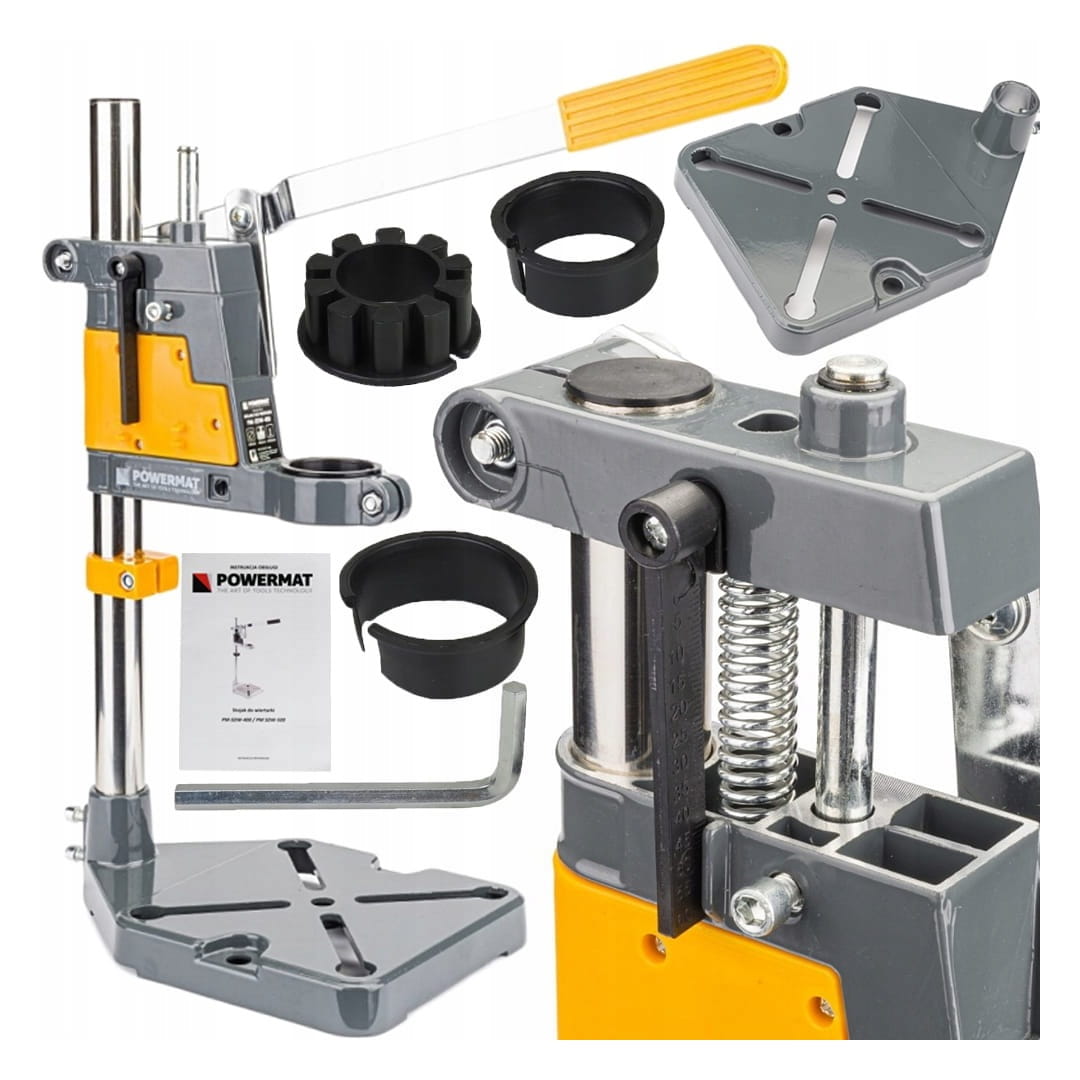 Stojak do wiertarki zmienia wiertarkę w wielofunkcyjne i praktyczne urządzenie. Stojak pozwala na pionową zmianę położenia zamocowanej wiertarki, dzięki czemu możliwa jest stabilna praca zmniejszająca prawdopodobieństwo złamania lub uszkodzenia wiertła. Doskonałe urządzenie do precyzyjnego wiercenia otworów w różnych materiałach. Korpus wykonany jest z aluminium, dzięki czemu całość jest lekka i wytrzymała. Obsługa zamocowanej wiertarki sprowadza się do sterowania dźwignią sprężynującą umożliwiającą samoczynny powrót wiertarki do pozycji początkowej. Stojak ma uniwersalne mocowanie do większości wiertarek ręcznych 38-41-43mm. Przydatny w każdym warsztacie domowym, jak i rzemieślniczym.