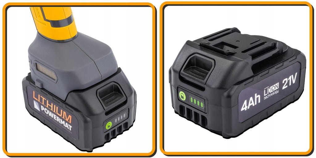 Szlifierka wyposażona jest w dwa akumulatory litowo-jonowe 21V o dużej pojemności 4000 mAh.