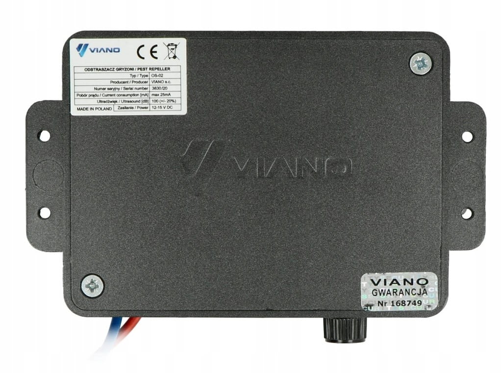 Wysokiej jakości odstraszacz gryzoni: kun, szczurów, myszy oraz innych szkodników, które często uszkadzają samochody. Urządzenie pochodzi od firmy Viano – polskiego producenta elektroniki, który specjalizuje się w tworzeniu tego rodzaju sprzętu. Odstraszacz emituje ultradźwięki o zmiennej częstotliwości w zasięgu do 200 m. Urządzenie zasilane jest napięciem 12 V, a jego wydajność prądowa to 15 mA.