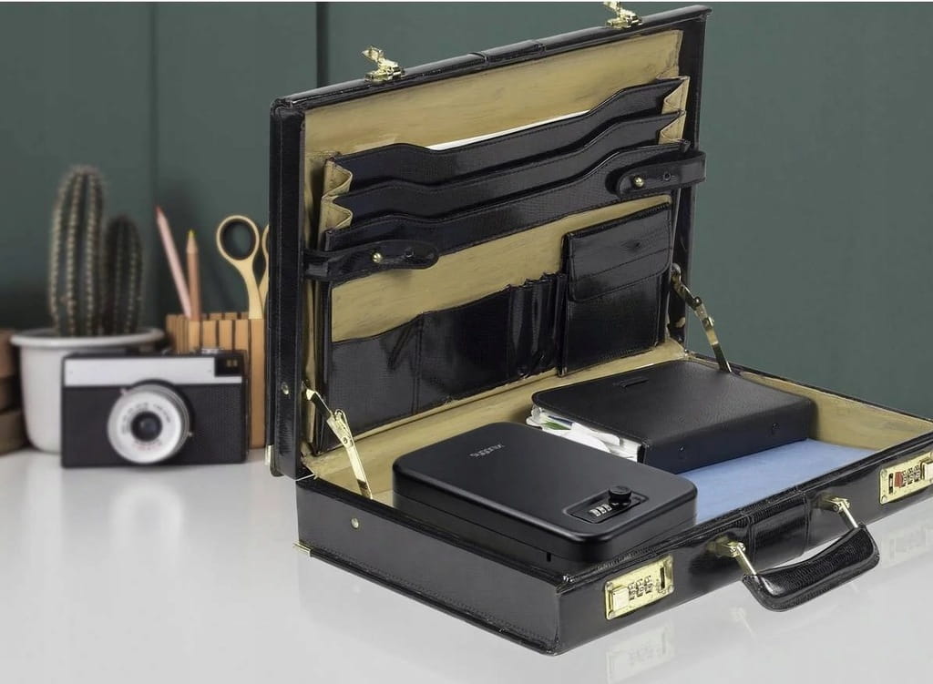 Przenośny sejf jest na tyle mały, że można go łatwo ukryć w torbie, plecaku czy szufladzie, co dodatkowo zwiększa poziom bezpieczeństwa poprzez dyskrecję.