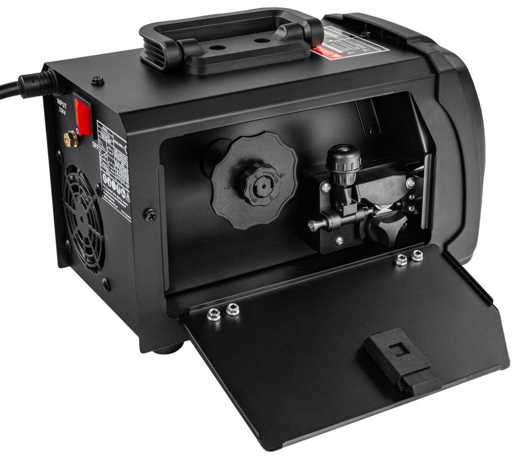 Regulujesz pracę przy pomocy dwóch pokręteł: napięcia oraz posuwu drutu, co daje czytelną i przewidywalną kontrolę nad procesem spawania.