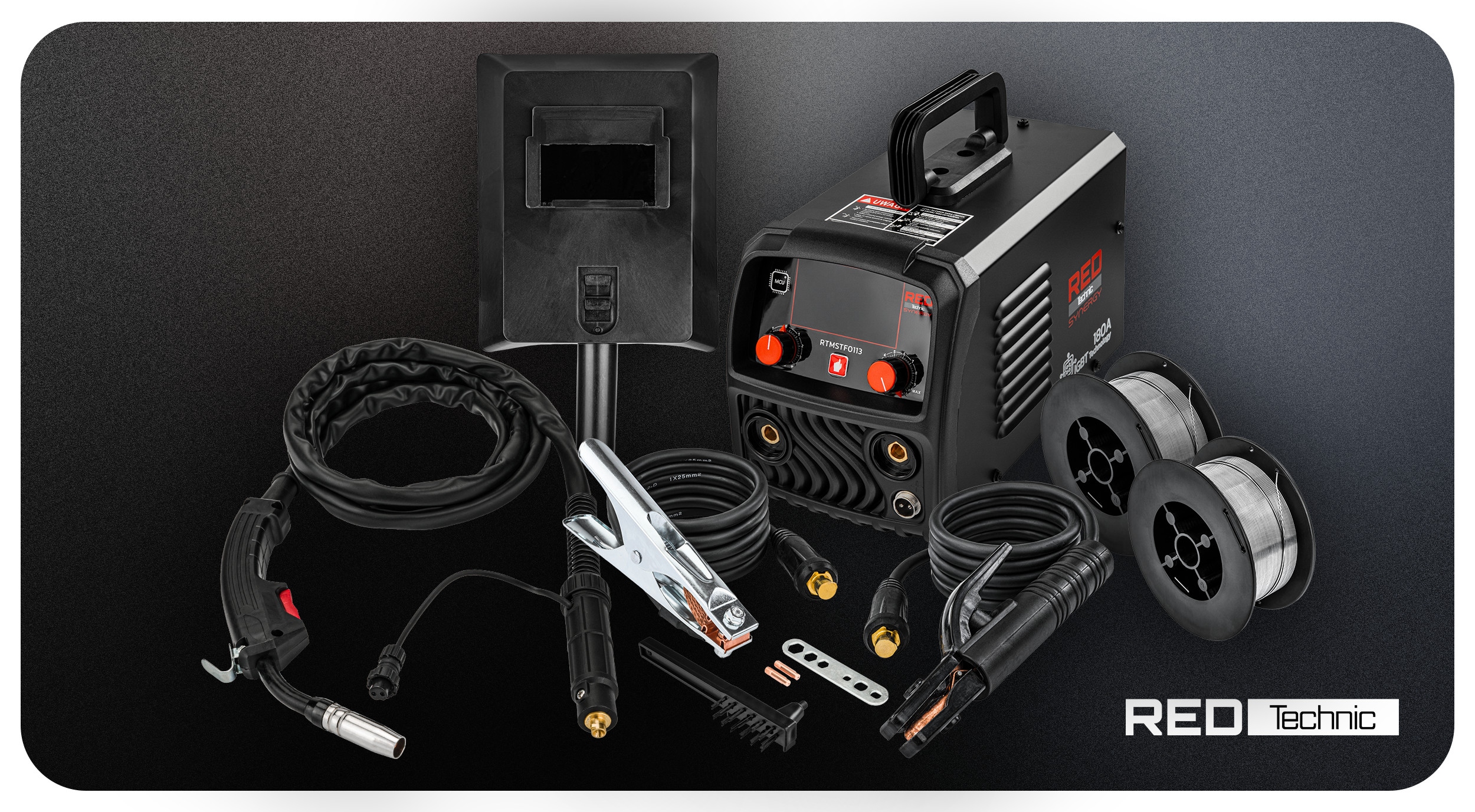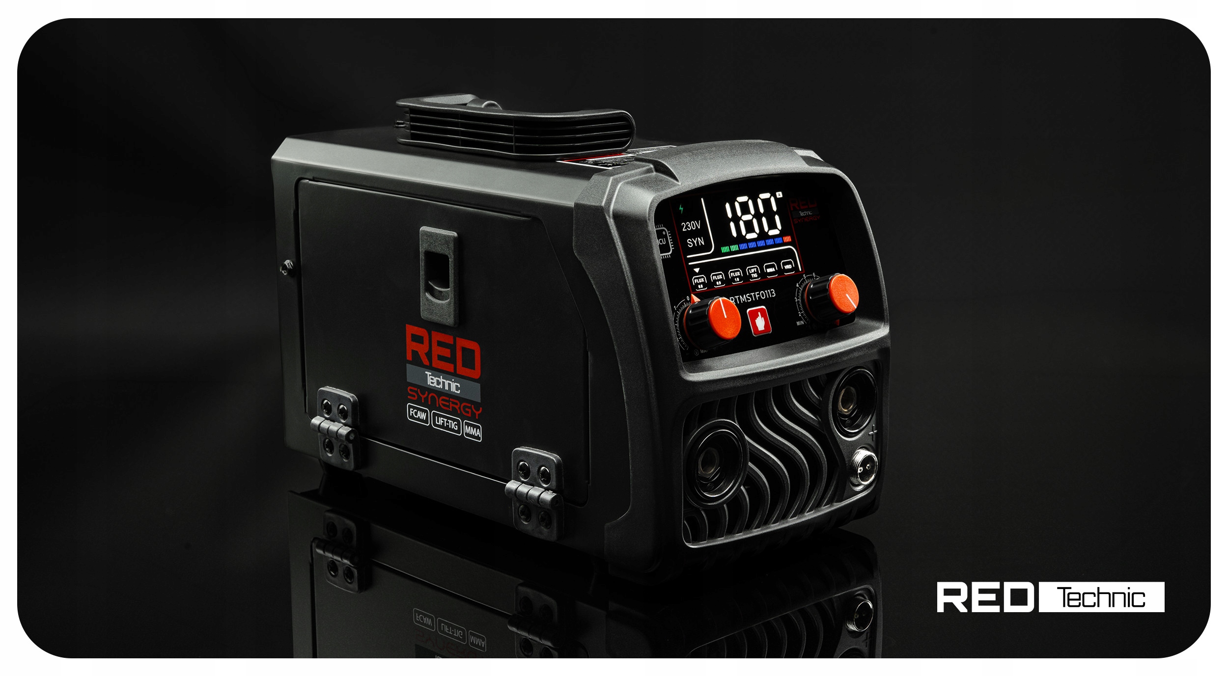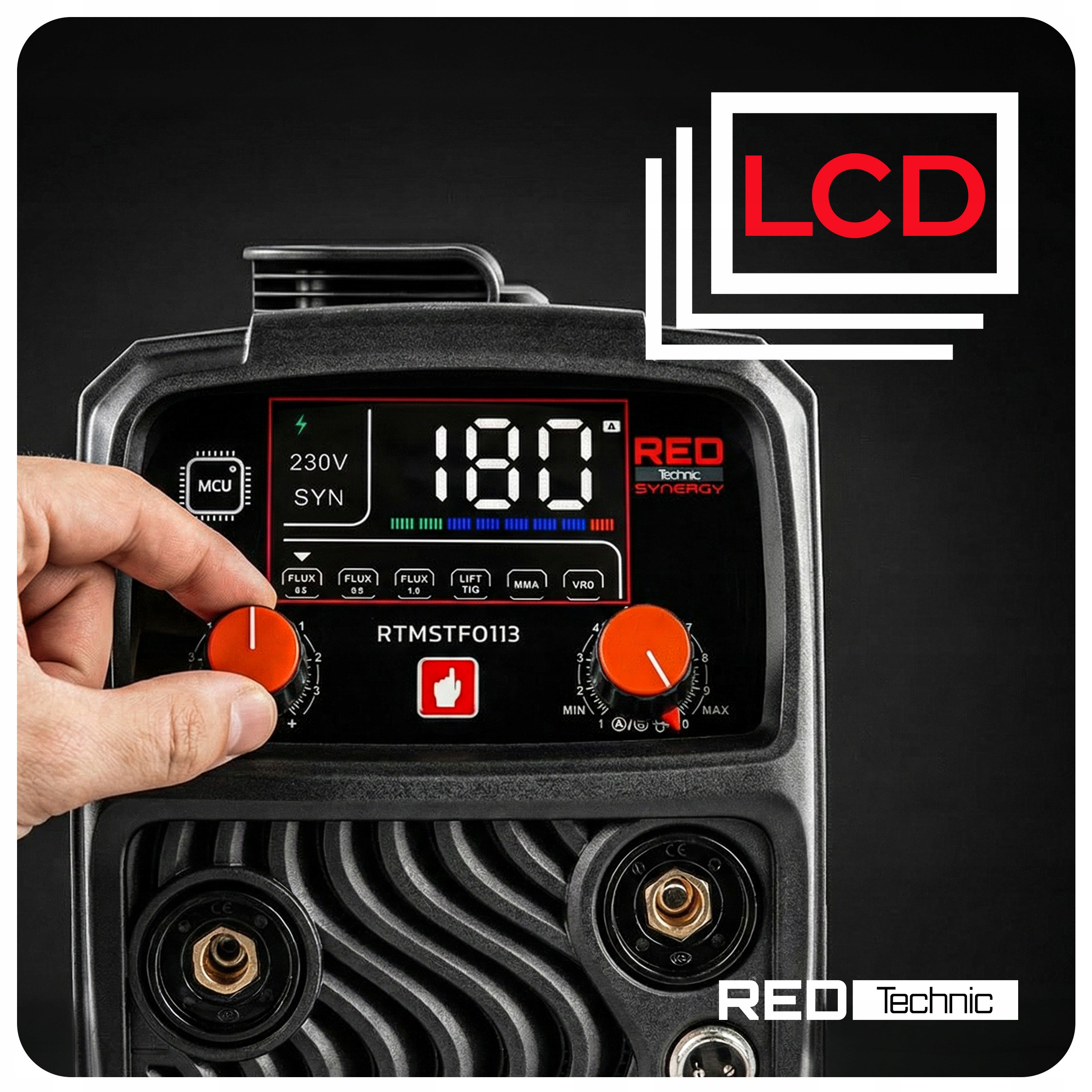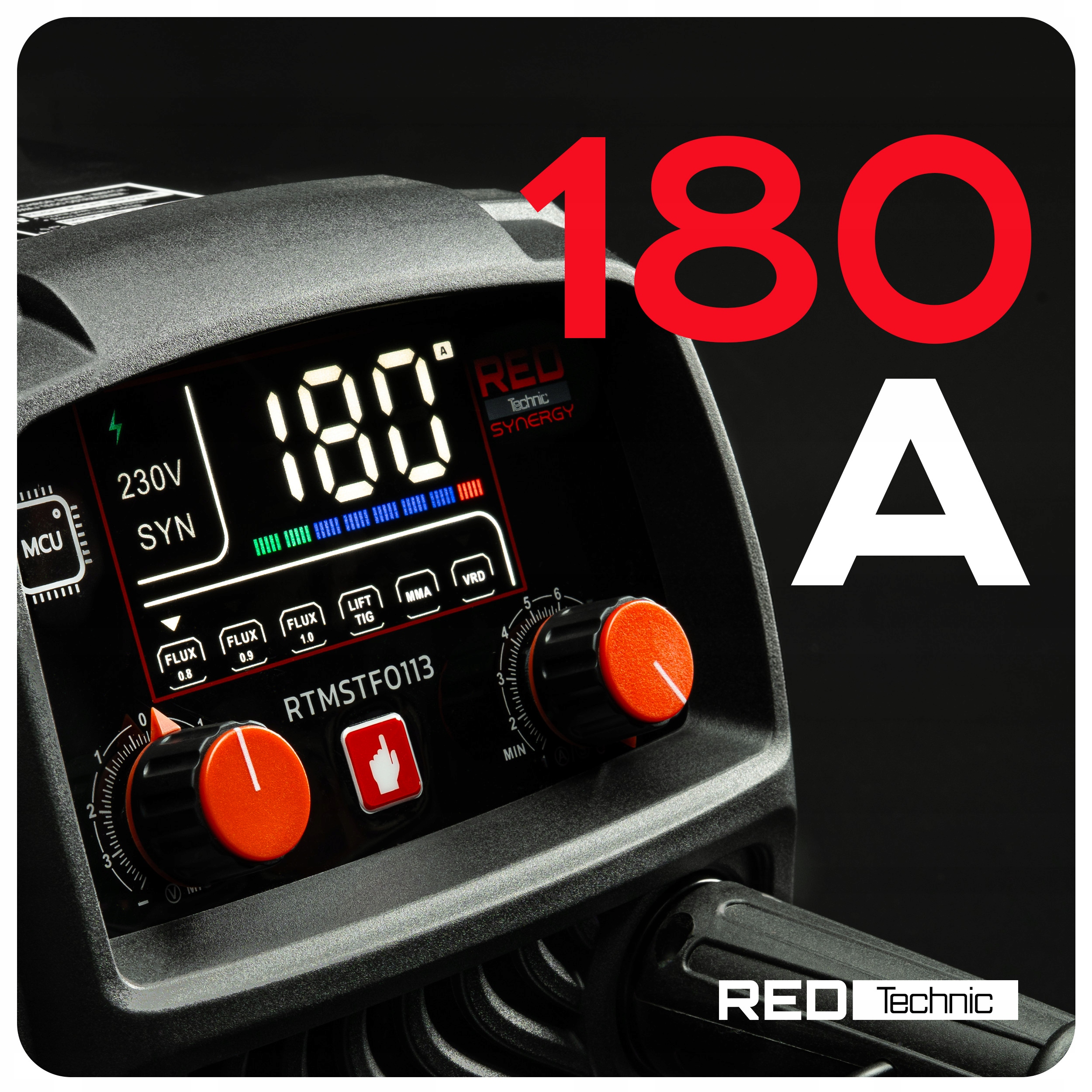 FCAW FLUX / MMA / TIG-LIFT | PRĄD SPAWANIA 180A | SYNERGIA | ZASILANIE 230V | TECHNOLOGIA IGBT | DRUT FLUX 0,8–1,0 mm | ELEKTRODY 1,6–4,0 mm | VRD | WYŚWIETLACZ LCD