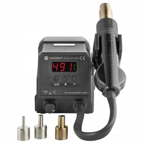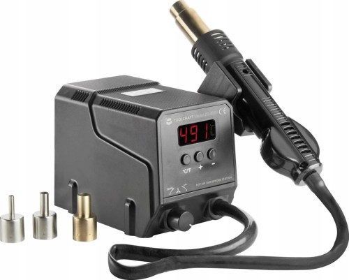 Urządzenie wyposażone jest w regulację temperatury lutowania i wymienne dysze powietrzne.
