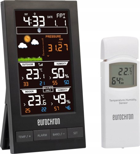 Dzięki radiowej stacji pogodowej marki Eurochron wszystkie dane pogodowe zawsze w zasięgu wzroku. Bezprzewodowy czujnik zewnętrzny pozwala uzyskać najdokładniejsze dane pogodowe dotyczące temperatury i wilgotności powietrza bez skomplikowanego okablowania. Stacja bazowa ma również czujnik temperatury i ciśnienia powietrza i pokazuje wszystkie istotne dane na pierwszy rzut oka. Ponadto stacja bazowa rejestruje minimalne i maksymalne wartości w ciągu dnia i oferuje funkcje prognozy pogody od 12 do 24 godzin oraz wbudowany alarm.
