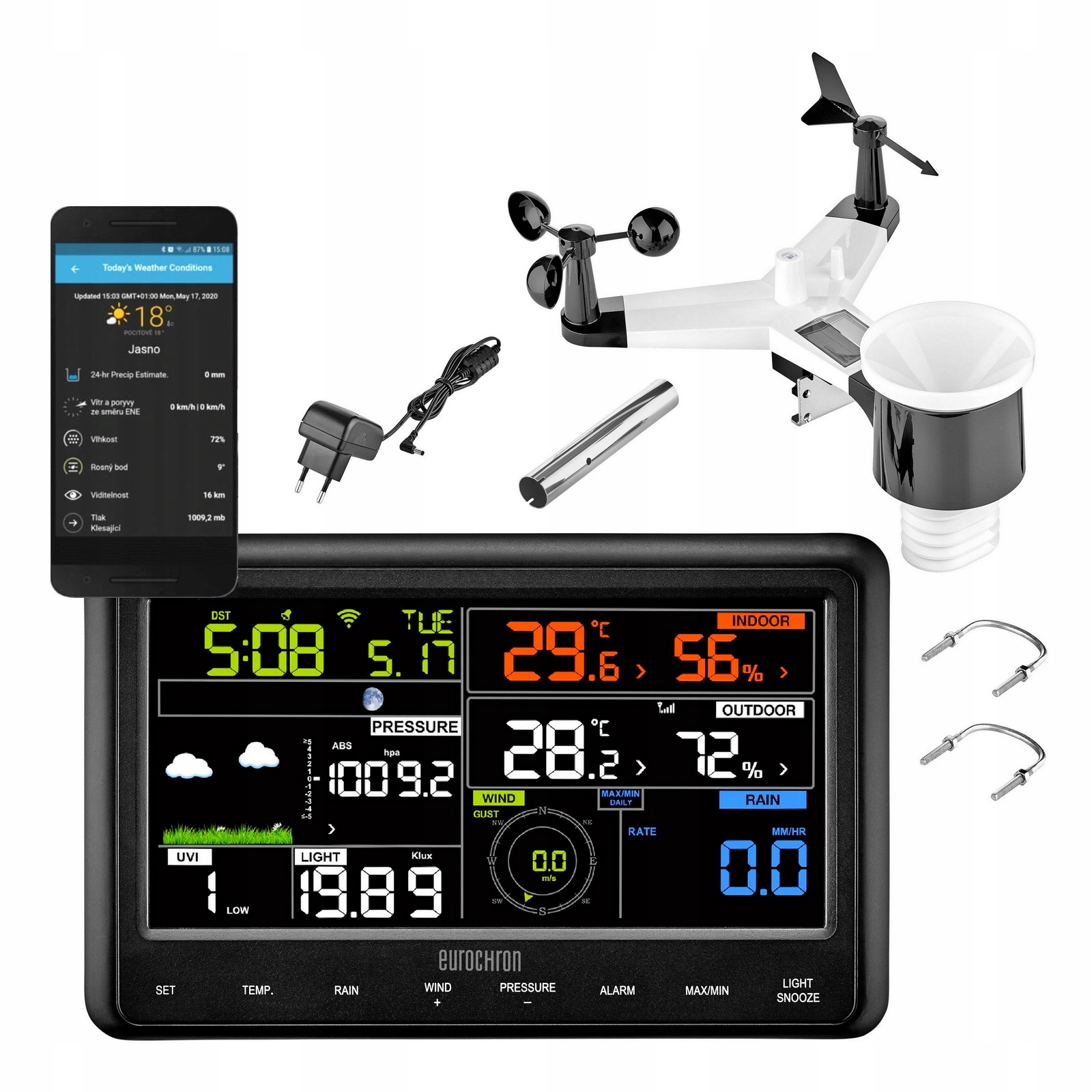 Komunikacja Wi-Fi data i czas z internetu. Bezprzewodowa transmisja danych z czujnika. Udostępnienie pomiarów w aplikacji mobilnej. Możliwość umieszczenia na ścianie. Temperatura wewnętrzna i zewnętrzna. Wilgotność powietrza wewnętrzna i zewnętrzna. Pomiar siły wiatru. Ciśnienie atmosferyczne. Tendencja ciśnienia atmosferycznego. Faza Księżyca. Historia ciśnienia. Prognoza pogody. Zegar i budzik z funkcją SNOOZE. Data i kalendarz.