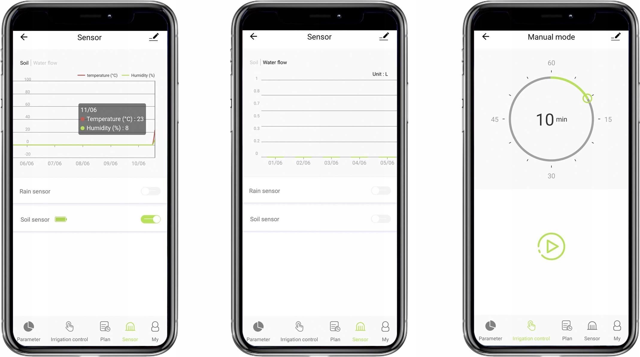 Ustaw i sprawdź harmonogram nawadniania za pomocą aplikacji. Historyczne dane o zużyciu wody, wilgotności gleby i temperaturze dostępne w aplikacji. Opóźnij harmonogram nawadniania na podstawie danych z czujnika gleby.