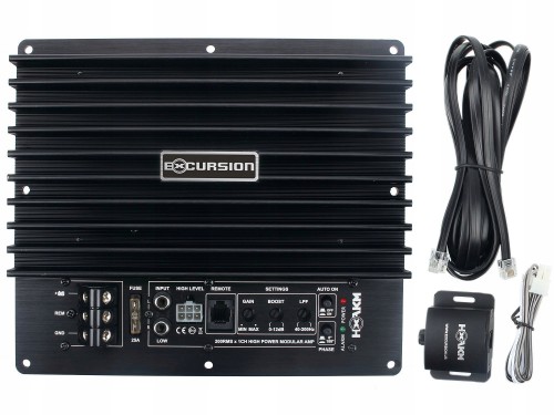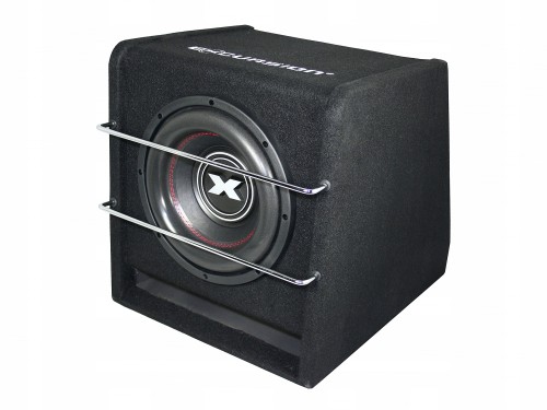 Kompletny aktywny subwoofer samochodowy z serii PX PLUG OEM UPGRADE niemieckiej marki Excursion, w skład którego wchodzi wydajny głośnik niskotonowy o średnicy 10"/25cm, moduł wzmacniacza 1-kanałowego wraz z niezbędnym wyposażeniem regulacyjnym wbudowany w boczną ściankę obudowy oraz ręcznie montowana profesjonalna obudowa bass-reflex o objętości 30 litrów z portem szczelinowym. Obudowa została w całości wykonana z wysokiej jakości płyty MDF o grubości 22/19 mm (przednia ścianka 22 mm / pozostałe 19 mm) i w standardowym wyposażeniu posiada wewnętrzne wytłumienie watoliną akustyczną oraz 2 chromowane metalowe pręty chroniące przód głośnika przed uszkodzeniem większymi przedmiotami. Z zewnątrz obudowa została wykończona czarną tkaniną obiciową o wysokiej trwałości. W zestawie znajduje się także zdalny regulator głośności subwoofera z przewodem oraz wiązka kabli ze złączem do gniazda wejść sygnału o poziomie głośnikowym HIGH Level.