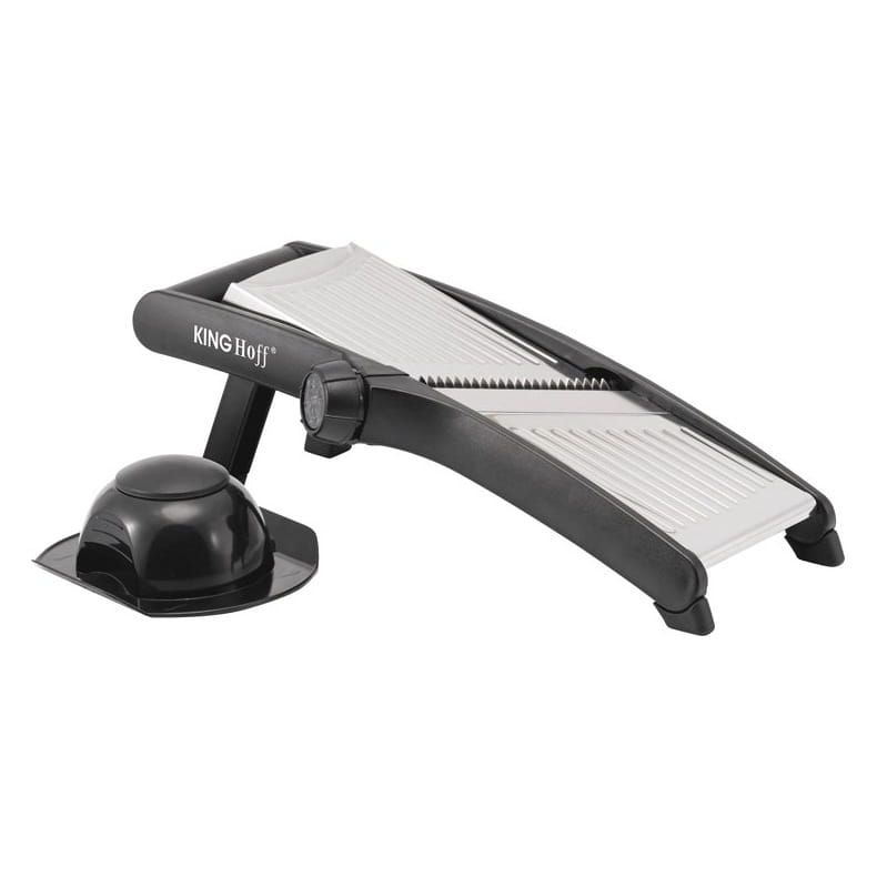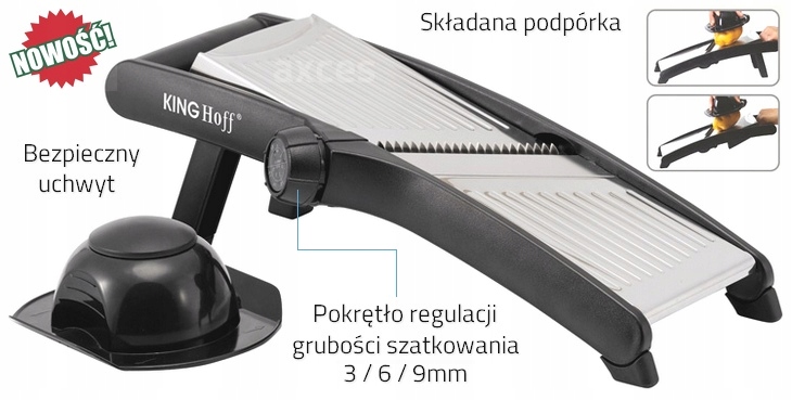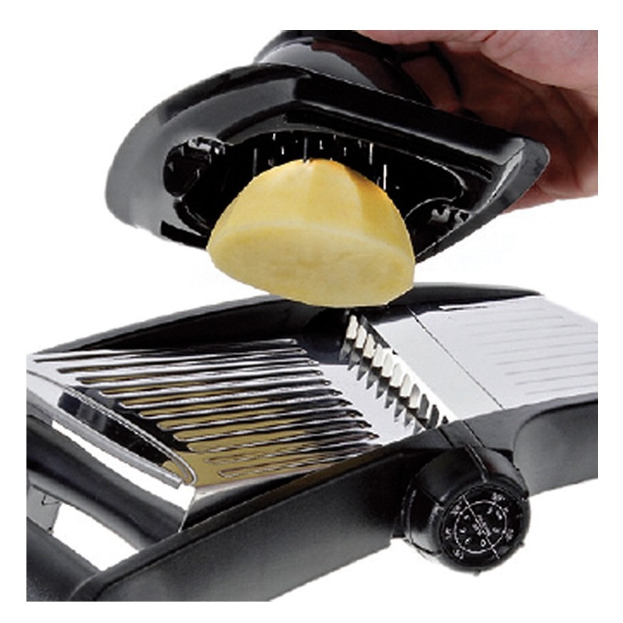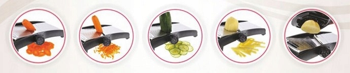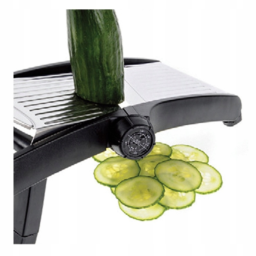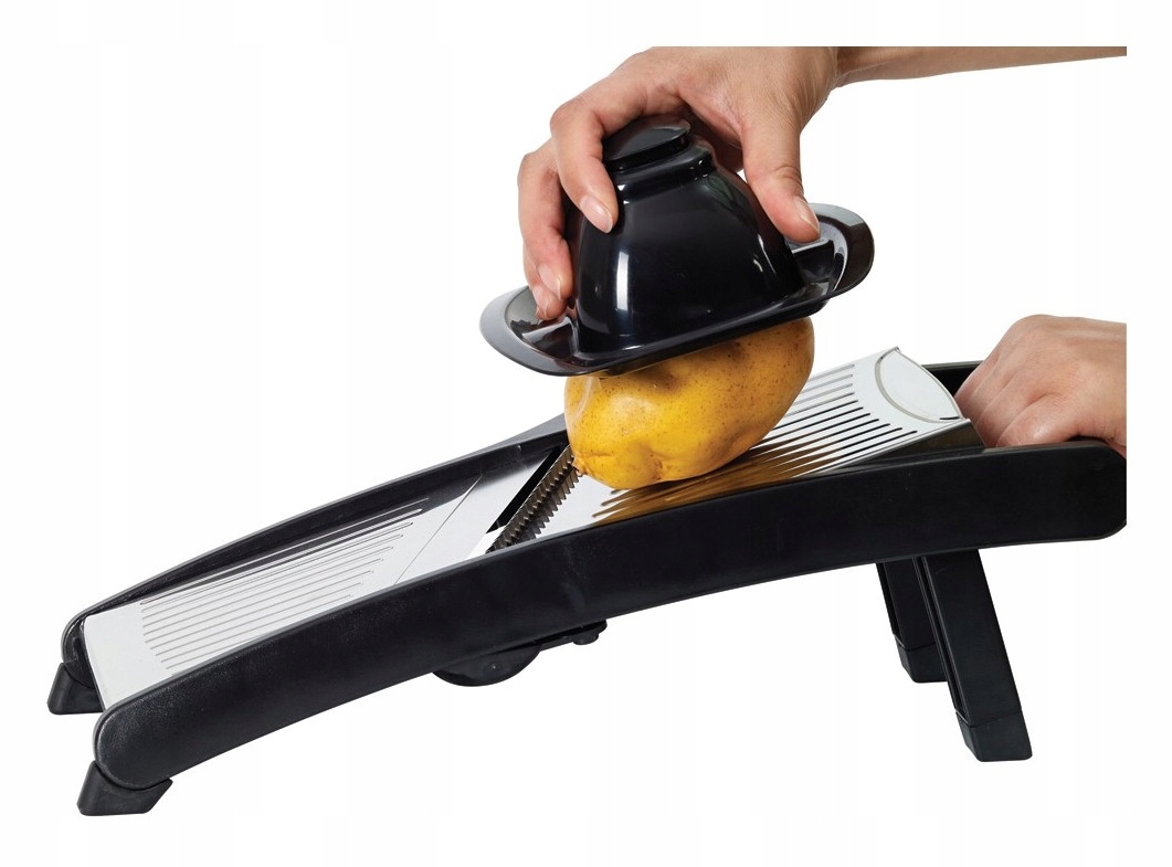 Składane nóżki ułatwiają szatkowanie w pozycji trzymanej w ręku. Pokrętło regulacyjne obraca ostrza zapewniając bezpieczniejszą i łatwiejszą regulację grubości szatkowania.