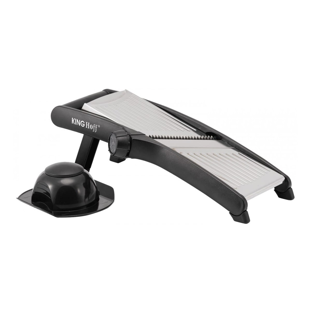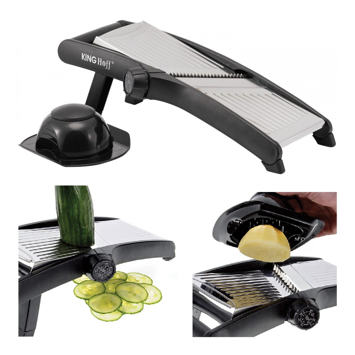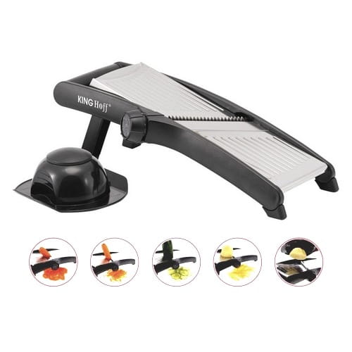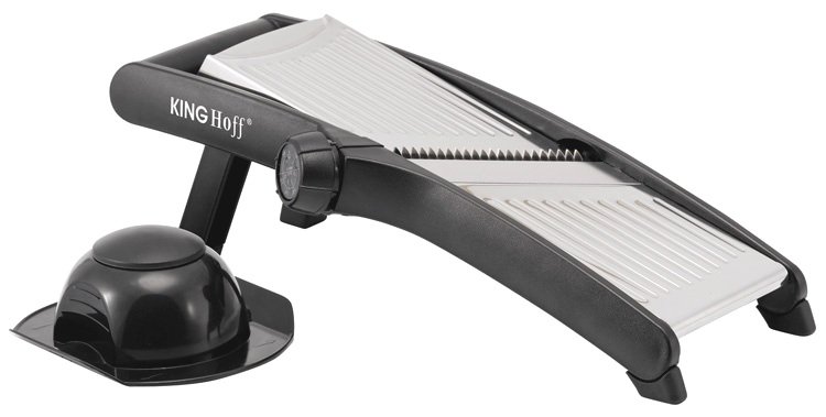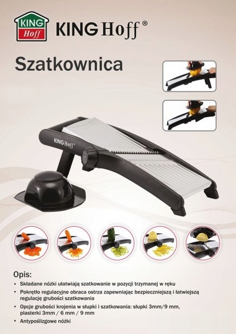 Składane nóżki ułatwiają szatkowanie w pozycji trzymanej w ręku. Pokrętło regulacyjne obraca ostrza zapewniając bezpieczniejszą i łatwiejszą regulację grubości szatkowania.