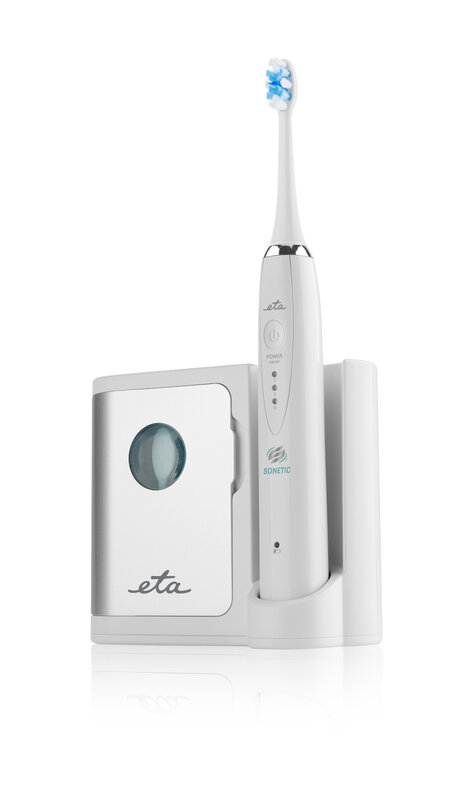 Eta Sonetic, to rewolucyjna technologia w higienie dentystycznej. Technologia MOVE. Maksymalna higiena – dezynfekcja szczoteczki za pomocą lampy odkażającej UV niszczy do 99,9% bakterii.