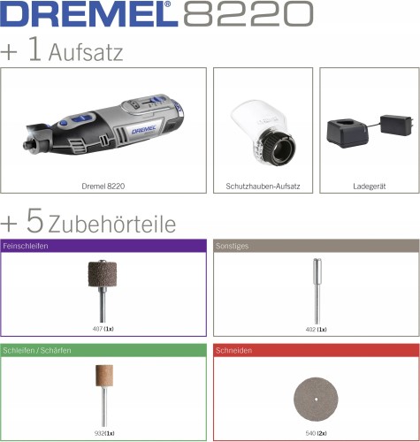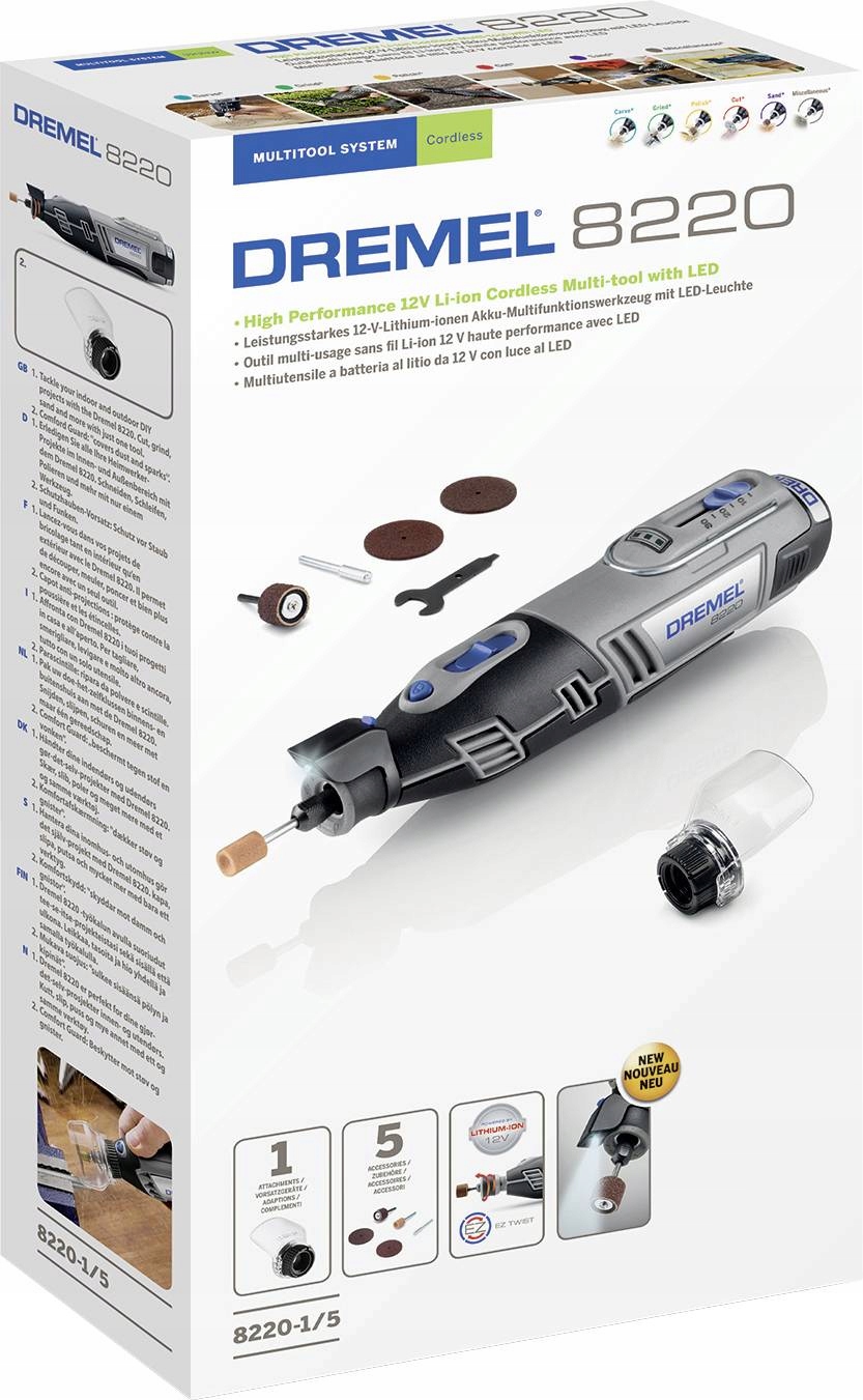 Wielofunkcyjne narzędzie akumulatorowe Dremel do różnorodnych zastosowań dzięki zmiennej prędkości obrotowej do 33 000 obr./min. Zawsze gotowy do użycia i idealny do wymagających prac dzięki nowej baterii litowo-jonowej 12 V / 2 Ah z elektroniką Cell Protection i szybkim czasem ładowania: ok. 1 h. Beznarzędziowy osprzęt zmienia się poprzez nasadkę EZ-Twist z wbudowanym kluczem zaciskowym. Maksymalna wydajność nawet pod obciążeniem dzięki wysokowydajnemu silnikowi z hamulcem silnikowym. Podświetlanie miejsca pracy dzięki 360-stopniowemu ruchomemu światłu LED z przodu urządzenia.