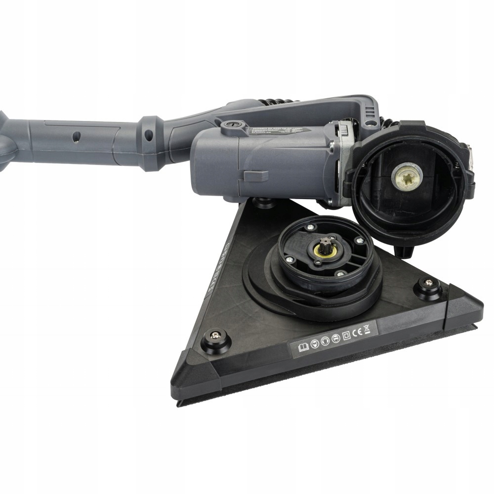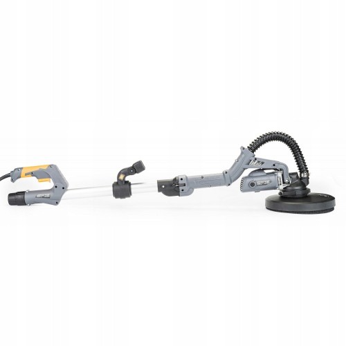 Szlifierka przegubowa bezpyłowa typu ŻYRAFA. Urządzenie doskonale sprawdza się podczas szlifowania gładzi gipsowych na ścianach, sufitach, a także wyżej położonych powierzchniach. Ruchoma, uchylna głowica pozwala na wygodne operowanie wysięgnikiem na powierzchniach ścian, sufitów, a nawet podłóg. Możliwość pracy pod kątem 90-180 stopni. Szlifierka wyposażona jest w przewód odprowadzający pył powstający przy szlifowaniu, przewód ten należy podłączyć do odkurzacza przemysłowego. Urządzenie wyposażone jest w pokrętło regulacji obrotów i lampkę LED.