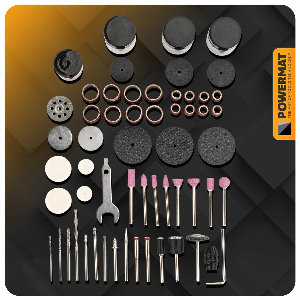 W komplecie znajduje się ponad 180 akcesoriów, w tym frezy, wiertła, szczotki, tarcze i papiery ścierne, zwiększając możliwości urządzenia.